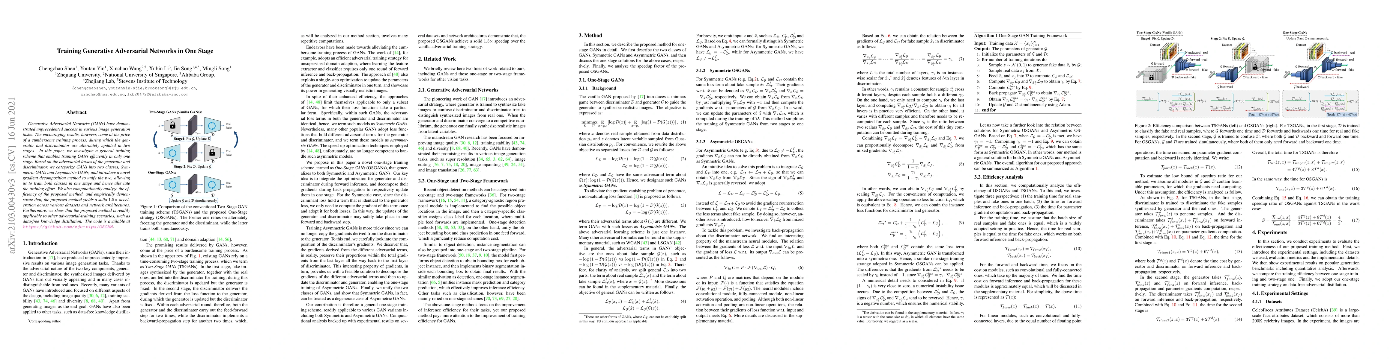 This paper proposes a novel training scheme to efficiently train Generative Adversarial Networks (GANs) in one stage, categorizing them into Symmetric and Asymmetric GANs and introducing a gradient decomposition method to unify them. The method achieves a $1.5\times$ training speedup across various datasets and network architectures, and is also applicable to other adversarial-training scenarios.