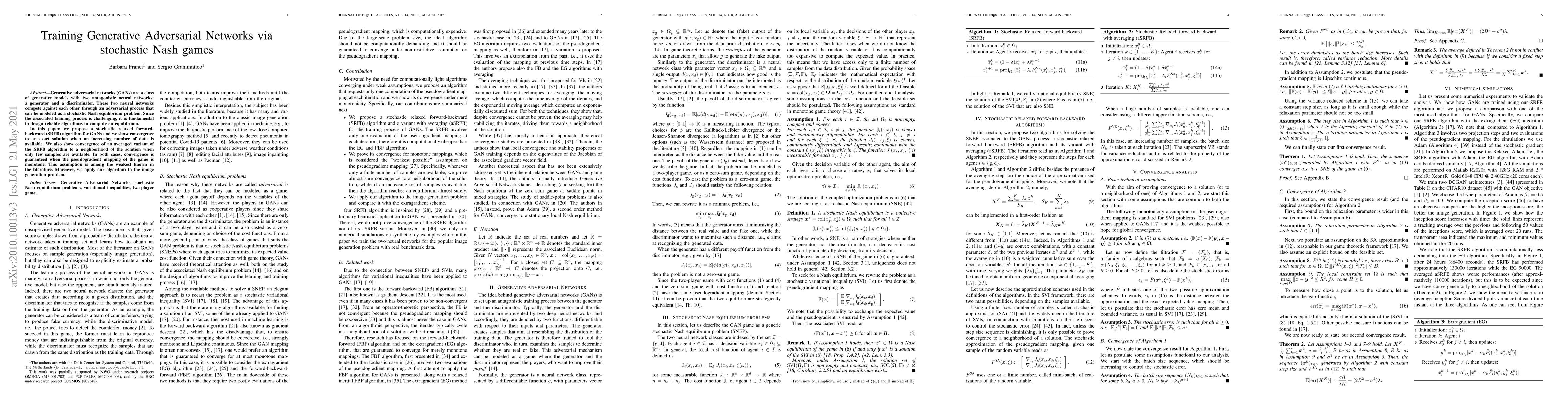 Generative adversarial networks (GANs) are a class of generative models with two antagonistic neural networks: a generator and a discriminator. These two neural networks compete against each other through an adversarial process that can be modeled as a stochastic Nash equilibrium problem. Since the associated training process is challenging, it is fundamental to design reliable algorithms to compute an equilibrium. In this paper, we propose a stochastic relaxed forward-backward (SRFB) algorithm for GANs and we show convergence to an exact solution when an increasing number of data is available. We also show convergence of an averaged variant of the SRFB algorithm to a neighborhood of the solution when only few samples are available. In both cases, convergence is guaranteed when the pseudogradient mapping of the game is monotone. This assumption is among the weakest known in the literature. Moreover, we apply our algorithm to the image generation problem.