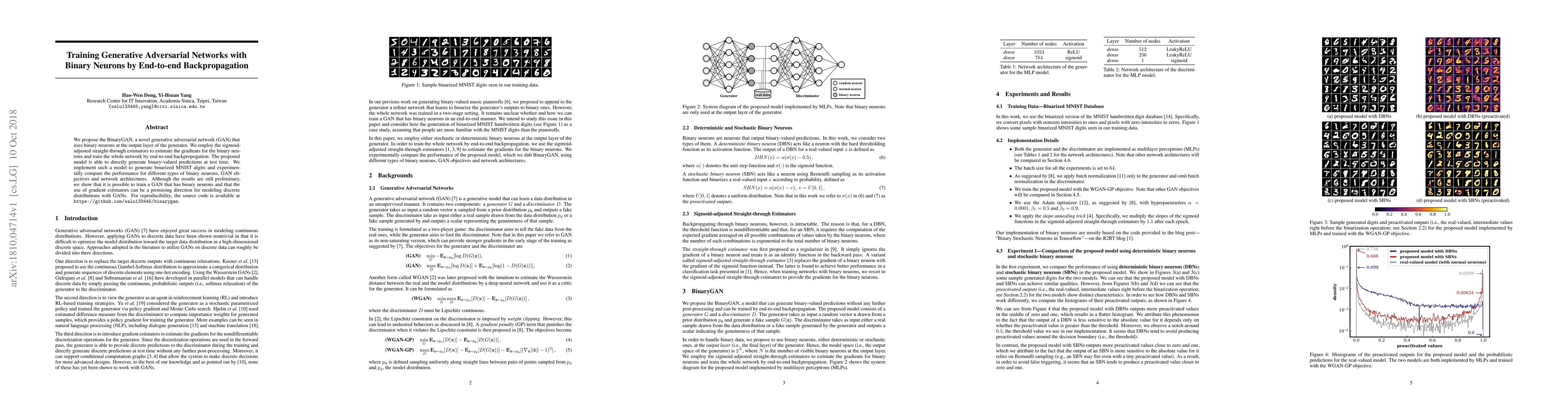 We propose the BinaryGAN, a novel generative adversarial network (GAN) that uses binary neurons at the output layer of the generator. We employ the sigmoid-adjusted straight-through estimators to estimate the gradients for the binary neurons and train the whole network by end-to-end backpropogation. The proposed model is able to directly generate binary-valued predictions at test time. We implement such a model to generate binarized MNIST digits and experimentally compare the performance for different types of binary neurons, GAN objectives and network architectures. Although the results are still preliminary, we show that it is possible to train a GAN that has binary neurons and that the use of gradient estimators can be a promising direction for modeling discrete distributions with GANs. For reproducibility, the source code is available at https://github.com/salu133445/binarygan .