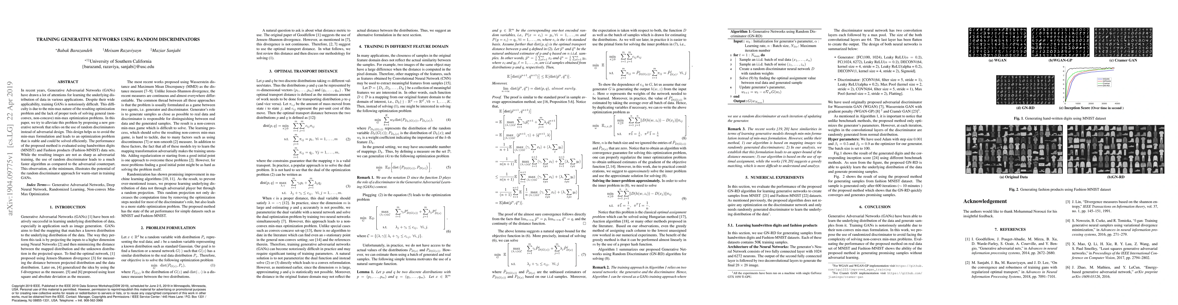 In recent years, Generative Adversarial Networks (GANs) have drawn a lot of attentions for learning the underlying distribution of data in various applications. Despite their wide applicability, training GANs is notoriously difficult. This difficulty is due to the min-max nature of the resulting optimization problem and the lack of proper tools of solving general (non-convex, non-concave) min-max optimization problems. In this paper, we try to alleviate this problem by proposing a new generative network that relies on the use of random discriminators instead of adversarial design. This design helps us to avoid the min-max formulation and leads to an optimization problem that is stable and could be solved efficiently. The performance of the proposed method is evaluated using handwritten digits (MNIST) and Fashion products (Fashion-MNIST) data sets. While the resulting images are not as sharp as adversarial training, the use of random discriminator leads to a much faster algorithm as compared to the adversarial counterpart. This observation, at the minimum, illustrates the potential of the random discriminator approach for warm-start in training GANs.