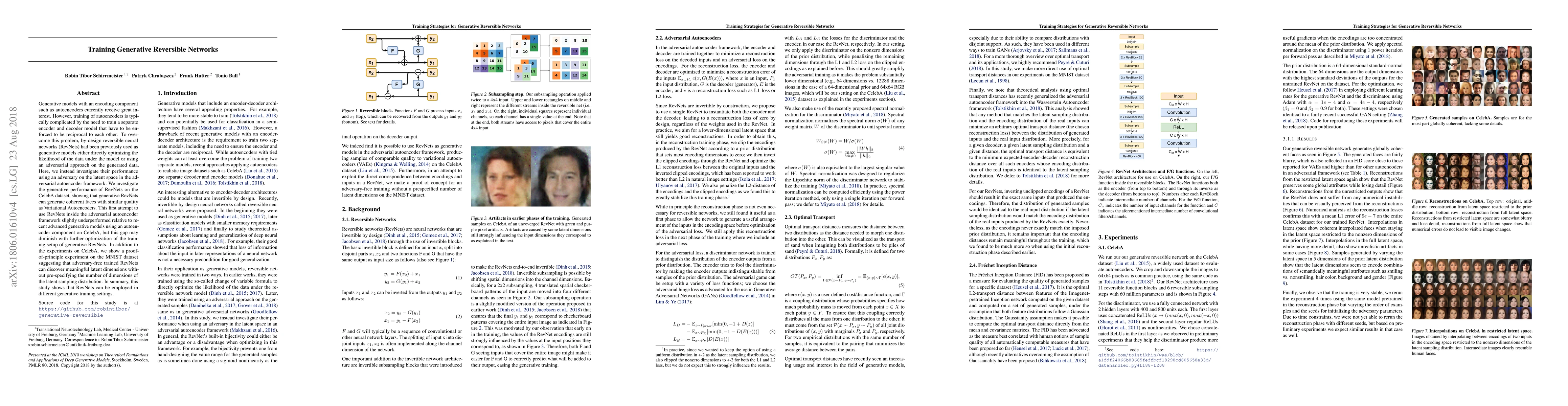 Generative models with an encoding component such as autoencoders currently receive great interest. However, training of autoencoders is typically complicated by the need to train a separate encoder and decoder model that have to be enforced to be reciprocal to each other. To overcome this problem, by-design reversible neural networks (RevNets) had been previously used as generative models either directly optimizing the likelihood of the data under the model or using an adversarial approach on the generated data. Here, we instead investigate their performance using an adversary on the latent space in the adversarial autoencoder framework. We investigate the generative performance of RevNets on the CelebA dataset, showing that generative RevNets can generate coherent faces with similar quality as Variational Autoencoders. This first attempt to use RevNets inside the adversarial autoencoder framework slightly underperformed relative to recent advanced generative models using an autoencoder component on CelebA, but this gap may diminish with further optimization of the training setup of generative RevNets. In addition to the experiments on CelebA, we show a proof-of-principle experiment on the MNIST dataset suggesting that adversary-free trained RevNets can discover meaningful latent dimensions without pre-specifying the number of dimensions of the latent sampling distribution. In summary, this study shows that RevNets can be employed in different generative training settings. Source code for this study is at https://github.com/robintibor/generative-reversible