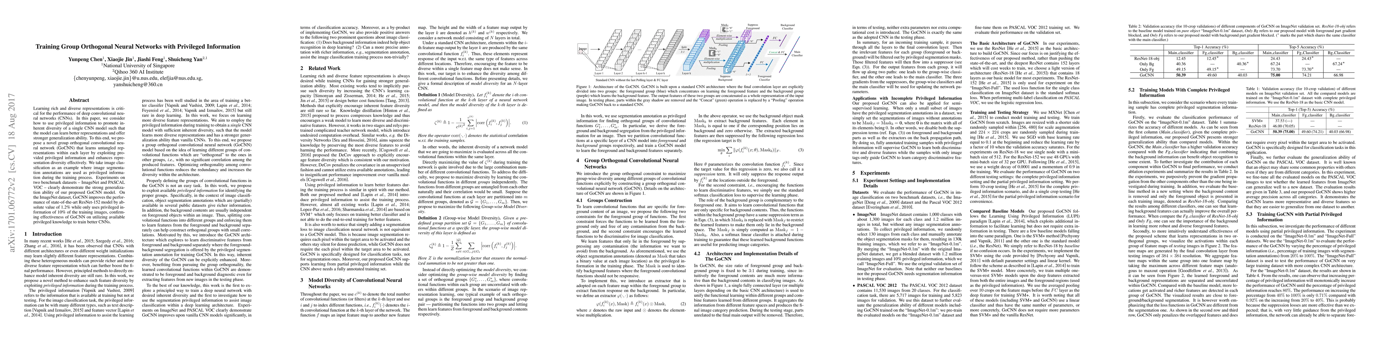 This paper proposes a novel group orthogonal convolutional neural network (GoCNN) to enhance representation diversity using privileged information, improving generalization. Experiments on ImageNet and PASCAL VOC show GoCNN's effectiveness, notably boosting the ResNet-152 model's performance by 1.2% using only 10% of training images with segmentation annotations.