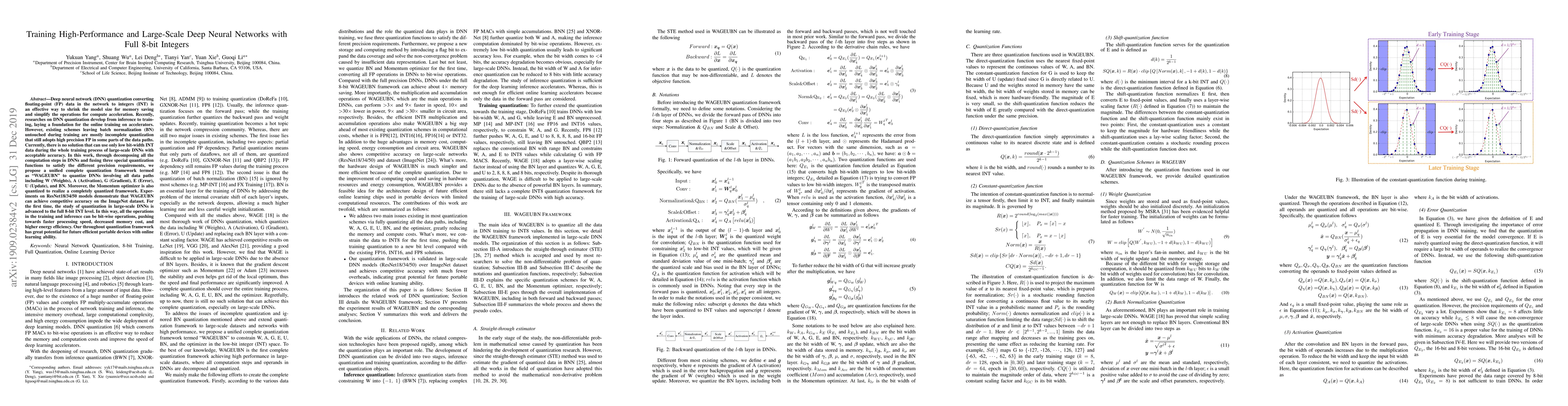 This paper proposes a complete quantization framework named "WAGEUBN" to fully utilize 8-bit integers in training large-scale deep neural networks, achieving competitive accuracy on ImageNet without relying on high-precision floating-point data. This approach enables bit-wise operations throughout training and inference, enhancing processing speed and energy efficiency.