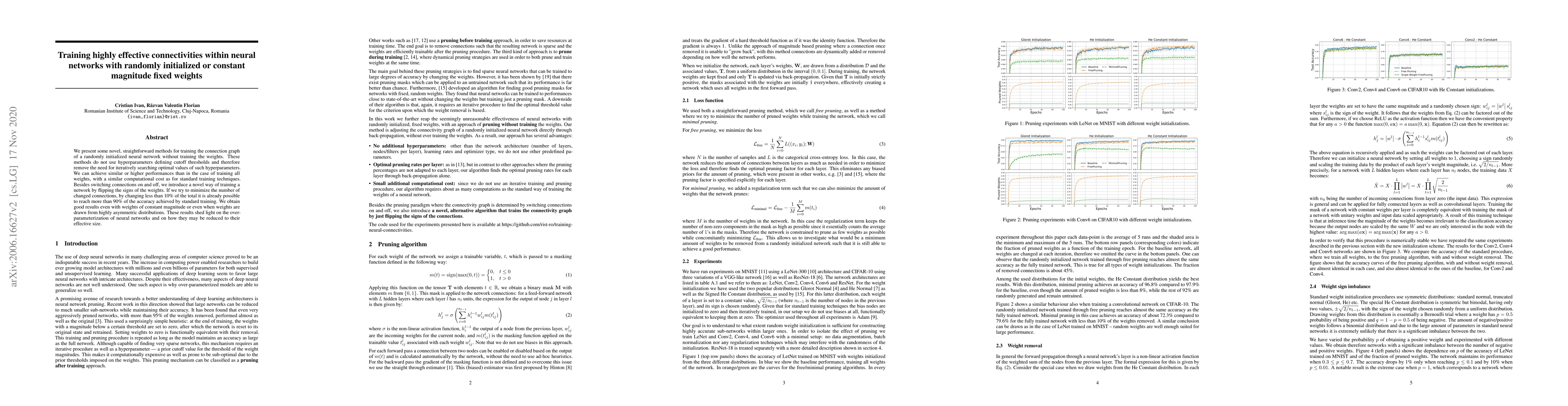 We present some novel, straightforward methods for training the connection graph of a randomly initialized neural network without training the weights. These methods do not use hyperparameters defining cutoff thresholds and therefore remove the need for iteratively searching optimal values of such hyperparameters. We can achieve similar or higher performances than in the case of training all weights, with a similar computational cost as for standard training techniques. Besides switching connections on and off, we introduce a novel way of training a network by flipping the signs of the weights. If we try to minimize the number of changed connections, by changing less than 10% of the total it is already possible to reach more than 90% of the accuracy achieved by standard training. We obtain good results even with weights of constant magnitude or even when weights are drawn from highly asymmetric distributions. These results shed light on the over-parameterization of neural networks and on how they may be reduced to their effective size.