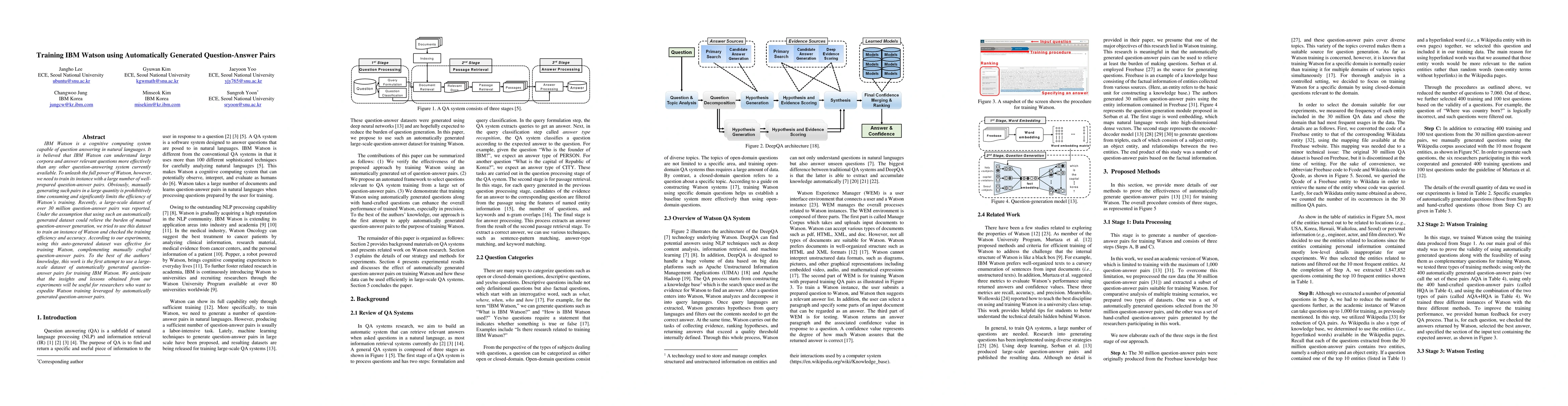 This paper explores training IBM Watson using a large-scale dataset of automatically generated question-answer pairs, finding it effective and complementary to manually crafted pairs. The study marks the first attempt to utilize such a dataset for Watson training, offering valuable insights for future research.