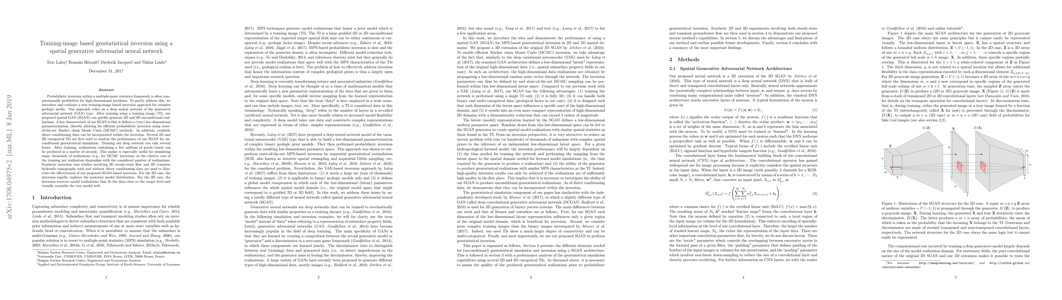 This paper proposes a spatial generative adversarial neural network (SGAN) for training-image based geostatistical inversion, enabling efficient generation of high-dimensional geological realizations. The SGAN, trained on a training image, allows for rapid simulation of millions of pixels/voxels, facilitating probabilistic inversion with Markov chain Monte Carlo methods.