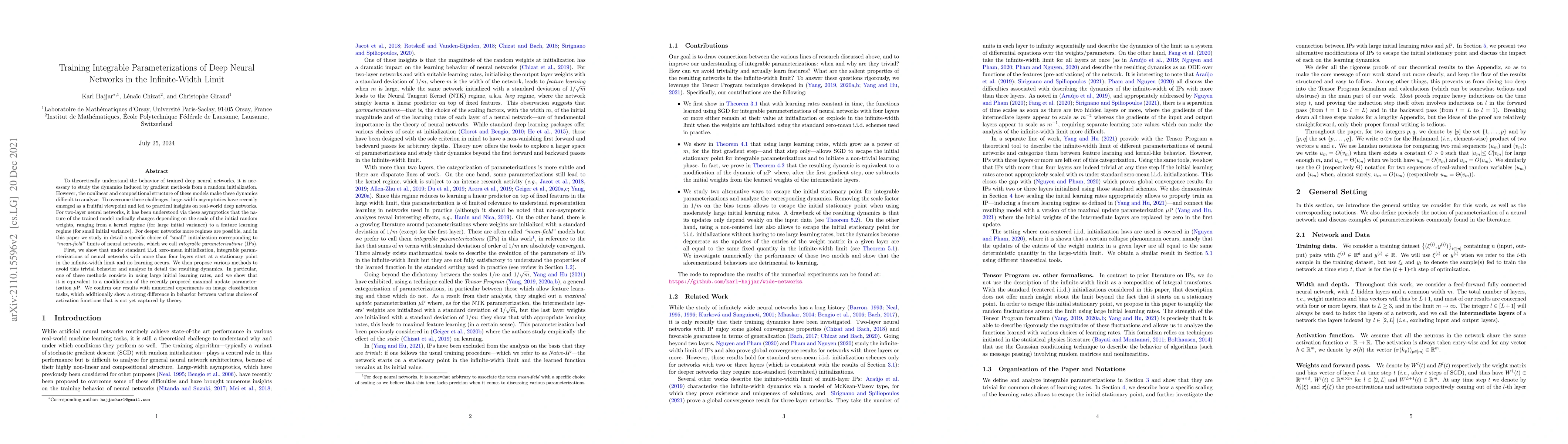 This paper explores the behavior of deep neural networks in the infinite-width limit, focusing on integrable parameterizations (IPs) under small initialization. It finds that networks with more than four layers start at a stationary point with standard initialization, leading to no learning, and proposes methods to overcome this, including large initial learning rates, which are shown to be equivalent to a modification of maximal update parameterization. Numerical experiments on image classification tasks reveal differences in behavior based on activation functions not yet explained by theory.