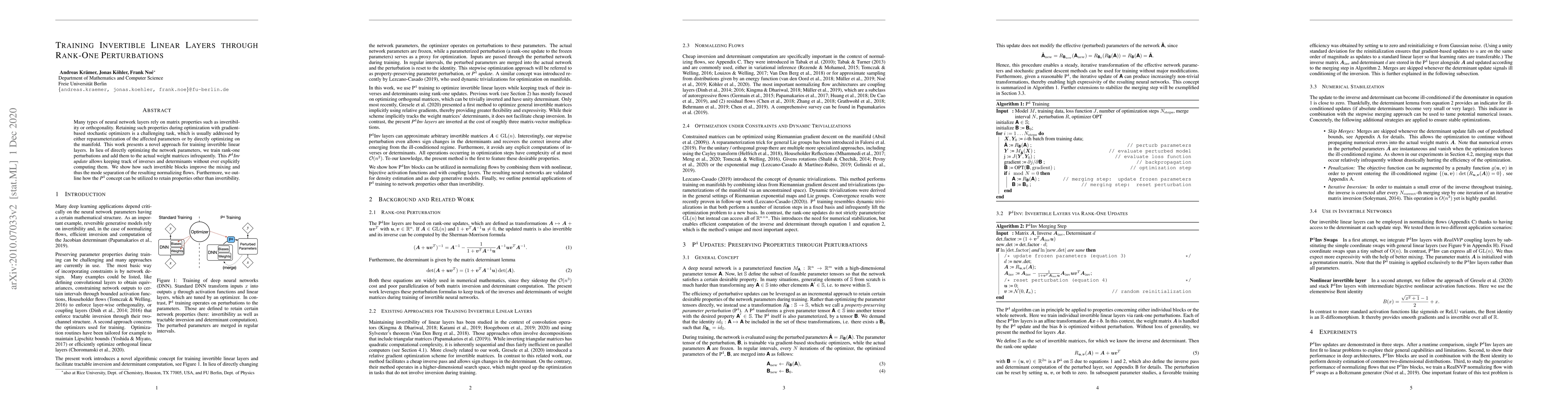 This paper introduces a novel method for training invertible linear layers by optimizing rank-one perturbations instead of directly adjusting network parameters. This P$^{4}$Inv update strategy maintains inverses and determinants implicitly, enhancing the mixing and mode separation of normalizing flows.