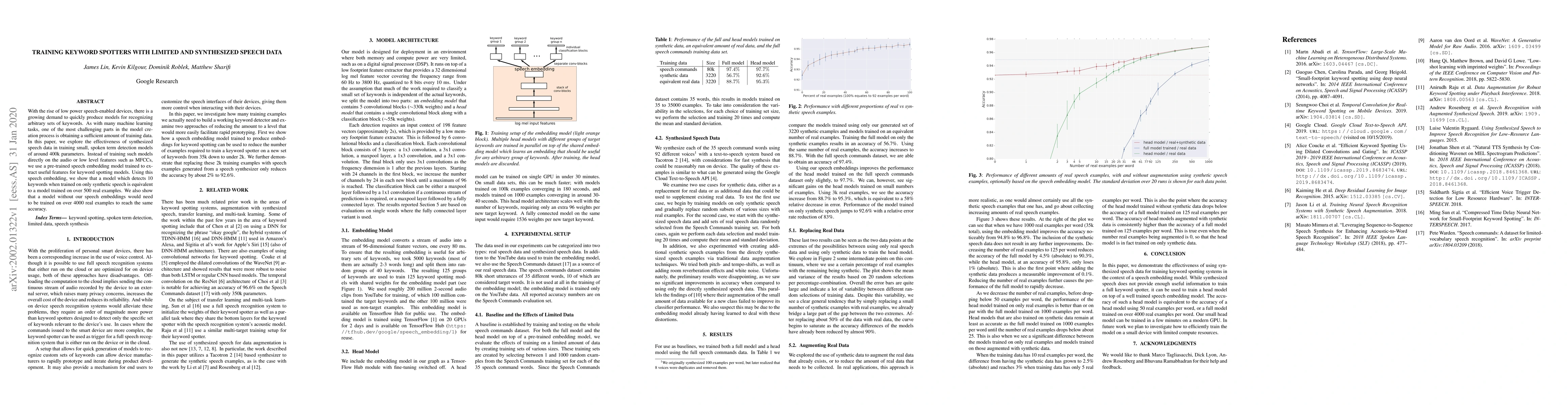 This paper explores using synthetic speech data to train small keyword spotting models, finding that with pre-trained speech embedding, a model can achieve high accuracy with just 500 synthetic examples, compared to 4000 real examples needed without embeddings.