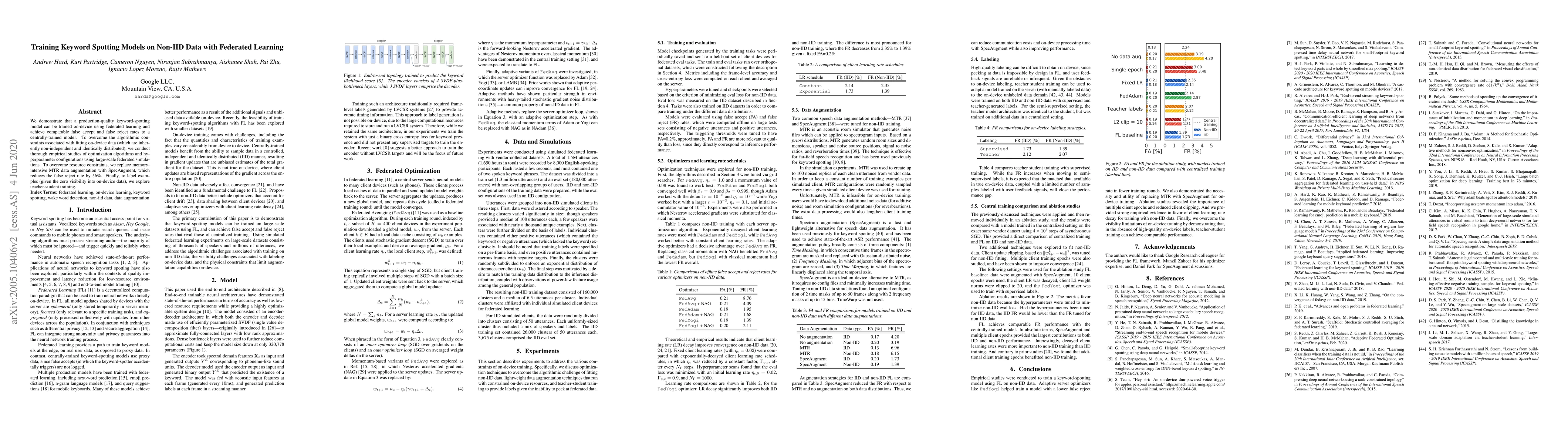 This paper trains keyword-spotting models on non-IID data using federated learning, achieving comparable performance to centrally-trained models. It employs optimization algorithms and hyperparameter tuning, SpecAugment for data augmentation, and teacher-student training to address resource and visibility constraints.