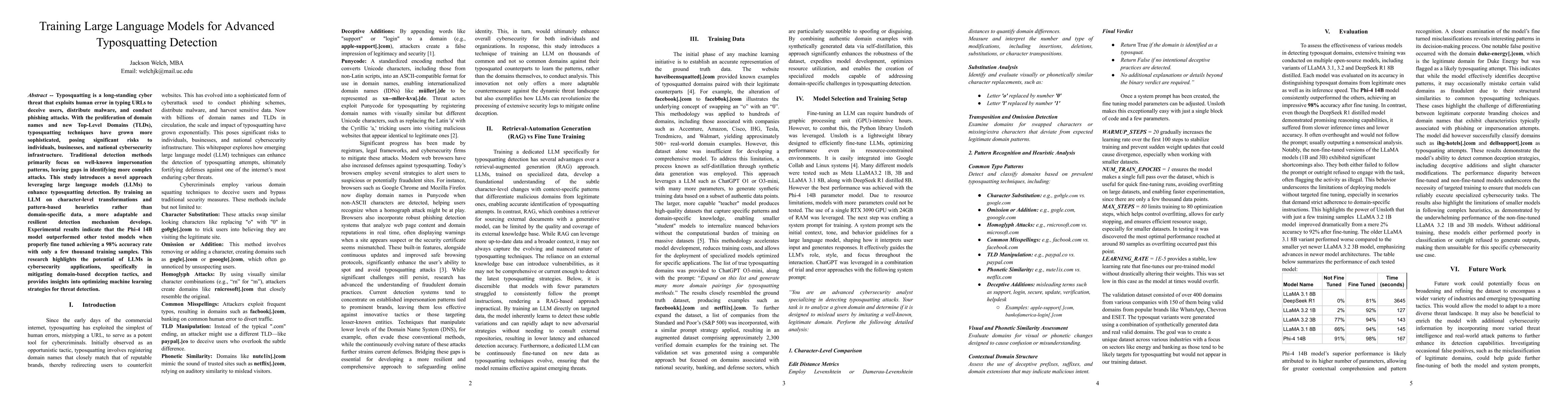 Researchers developed a novel approach to detect typosquatting using large language models, achieving 98% accuracy with only a few thousand training samples. This innovation highlights the potential of LLMs in mitigating domain-based deception tactics and provides insights into optimizing machine learning strategies for threat detection.