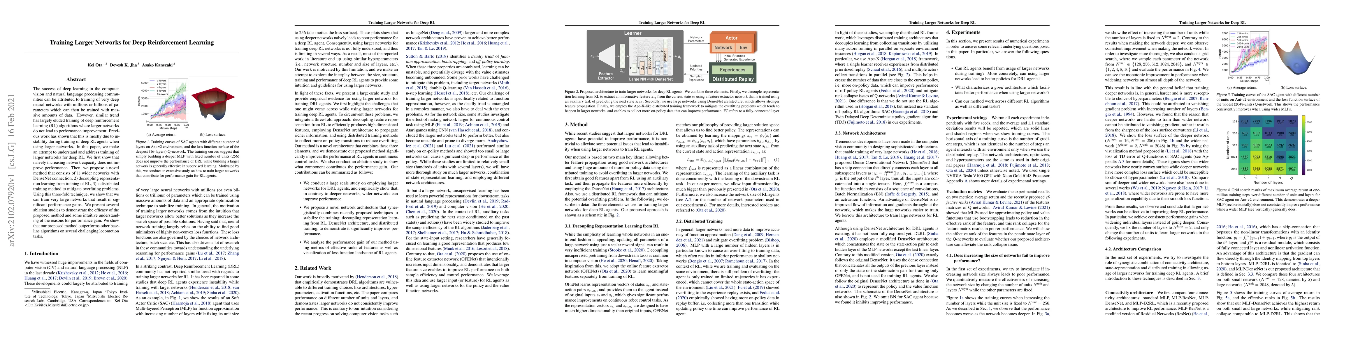 The success of deep learning in the computer vision and natural language processing communities can be attributed to training of very deep neural networks with millions or billions of parameters which can then be trained with massive amounts of data. However, similar trend has largely eluded training of deep reinforcement learning (RL) algorithms where larger networks do not lead to performance improvement. Previous work has shown that this is mostly due to instability during training of deep RL agents when using larger networks. In this paper, we make an attempt to understand and address training of larger networks for deep RL. We first show that naively increasing network capacity does not improve performance. Then, we propose a novel method that consists of 1) wider networks with DenseNet connection, 2) decoupling representation learning from training of RL, 3) a distributed training method to mitigate overfitting problems. Using this three-fold technique, we show that we can train very large networks that result in significant performance gains. We present several ablation studies to demonstrate the efficacy of the proposed method and some intuitive understanding of the reasons for performance gain. We show that our proposed method outperforms other baseline algorithms on several challenging locomotion tasks.