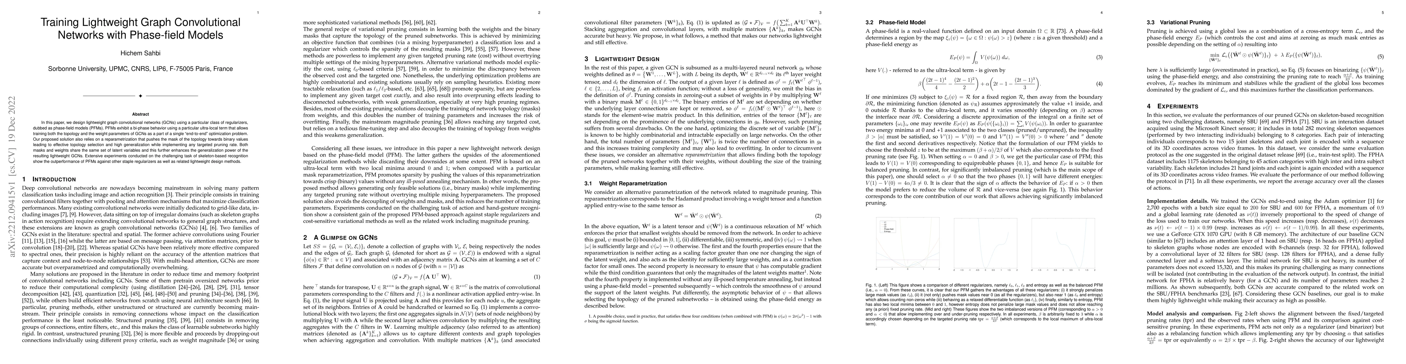 In this paper, we design lightweight graph convolutional networks (GCNs) using a particular class of regularizers, dubbed as phase-field models (PFMs). PFMs exhibit a bi-phase behavior using a particular ultra-local term that allows training both the topology and the weight parameters of GCNs as a part of a single "end-to-end" optimization problem. Our proposed solution also relies on a reparametrization that pushes the mask of the topology towards binary values leading to effective topology selection and high generalization while implementing any targeted pruning rate. Both masks and weights share the same set of latent variables and this further enhances the generalization power of the resulting lightweight GCNs. Extensive experiments conducted on the challenging task of skeleton-based recognition show the outperformance of PFMs against other staple regularizers as well as related lightweight design methods.