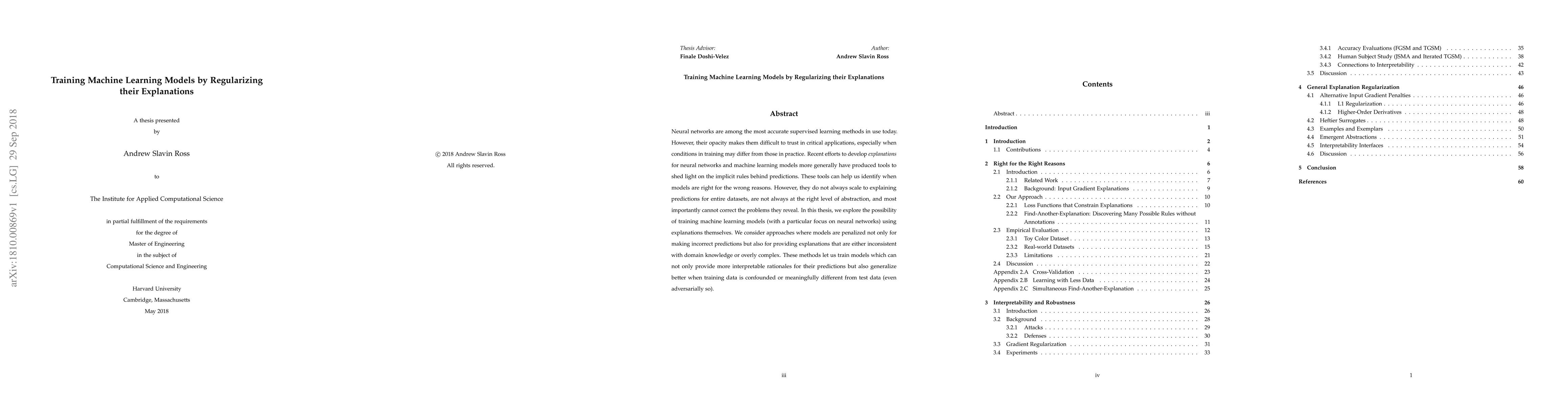 Neural networks are among the most accurate supervised learning methods in use today. However, their opacity makes them difficult to trust in critical applications, especially when conditions in training may differ from those in practice. Recent efforts to develop explanations for neural networks and machine learning models more generally have produced tools to shed light on the implicit rules behind predictions. These tools can help us identify when models are right for the wrong reasons. However, they do not always scale to explaining predictions for entire datasets, are not always at the right level of abstraction, and most importantly cannot correct the problems they reveal. In this thesis, we explore the possibility of training machine learning models (with a particular focus on neural networks) using explanations themselves. We consider approaches where models are penalized not only for making incorrect predictions but also for providing explanations that are either inconsistent with domain knowledge or overly complex. These methods let us train models which can not only provide more interpretable rationales for their predictions but also generalize better when training data is confounded or meaningfully different from test data (even adversarially so).