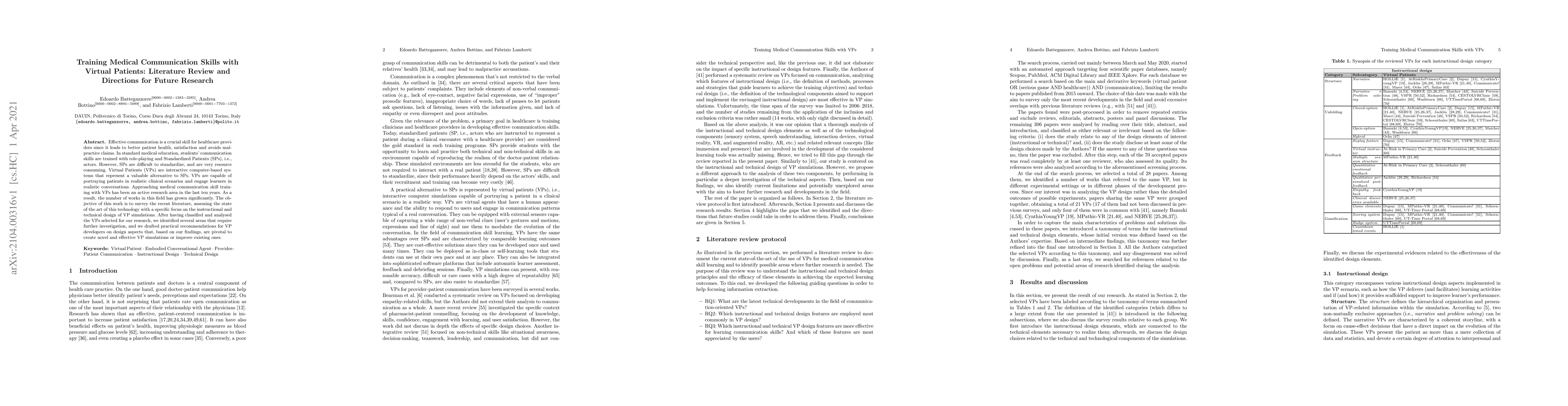 Effective communication is a crucial skill for healthcare providers since it leads to better patient health, satisfaction and avoids malpractice claims. In standard medical education, students' communication skills are trained with role-playing and Standardized Patients (SPs), i.e., actors. However, SPs are difficult to standardize, and are very resource consuming. Virtual Patients (VPs) are interactive computer-based systems that represent a valuable alternative to SPs. VPs are capable of portraying patients in realistic clinical scenarios and engage learners in realistic conversations. Approaching medical communication skill training with VPs has been an active research area in the last ten years. As a result, the number of works in this field has grown significantly. The objective of this work is to survey the recent literature, assessing the state of the art of this technology with a specific focus on the instructional and technical design of VP simulations. After having classified and analysed the VPs selected for our research, we identified several areas that require further investigation, and we drafted practical recommendations for VP developers on design aspects that, based on our findings, are pivotal to create novel and effective VP simulations or improve existing ones.
