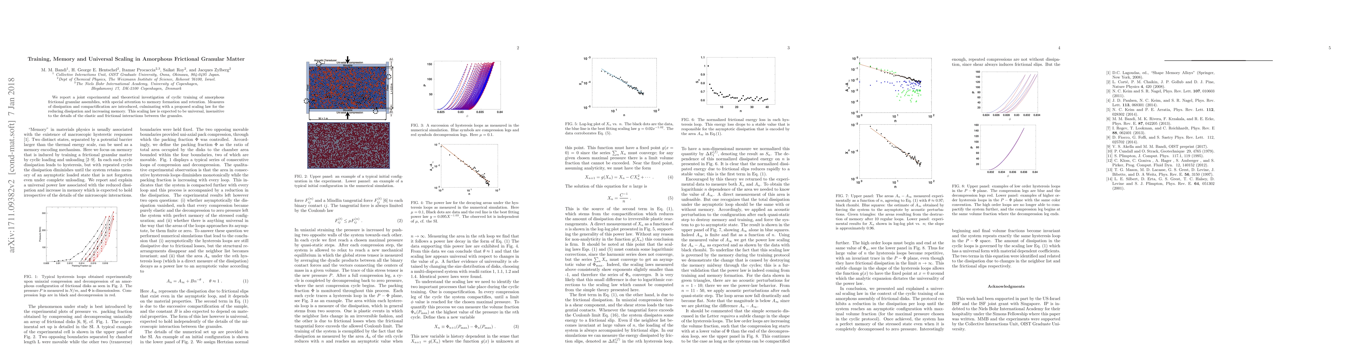 This paper investigates cyclic training in amorphous frictional granular systems, focusing on memory formation and retention. It proposes a universal scaling law relating reduced dissipation and increased memory, which is expected to be independent of the specific granular interactions.