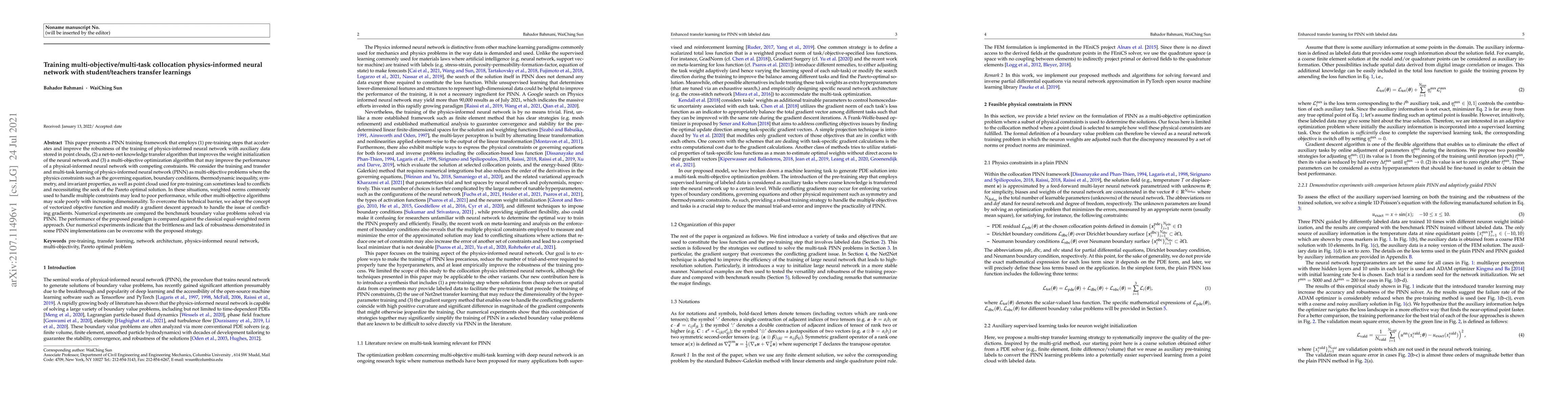 This paper presents a PINN training framework that employs (1) pre-training steps that accelerates and improve the robustness of the training of physics-informed neural network with auxiliary data stored in point clouds, (2) a net-to-net knowledge transfer algorithm that improves the weight initialization of the neural network and (3) a multi-objective optimization algorithm that may improve the performance of a physical-informed neural network with competing constraints. We consider the training and transfer and multi-task learning of physics-informed neural network (PINN) as multi-objective problems where the physics constraints such as the governing equation, boundary conditions, thermodynamic inequality, symmetry, and invariant properties, as well as point cloud used for pre-training can sometimes lead to conflicts and necessitating the seek of the Pareto optimal solution. In these situations, weighted norms commonly used to handle multiple constraints may lead to poor performance, while other multi-objective algorithms may scale poorly with increasing dimensionality. To overcome this technical barrier, we adopt the concept of vectorized objective function and modify a gradient descent approach to handle the issue of conflicting gradients. Numerical experiments are compared the benchmark boundary value problems solved via PINN. The performance of the proposed paradigm is compared against the classical equal-weighted norm approach. Our numerical experiments indicate that the brittleness and lack of robustness demonstrated in some PINN implementations can be overcome with the proposed strategy.