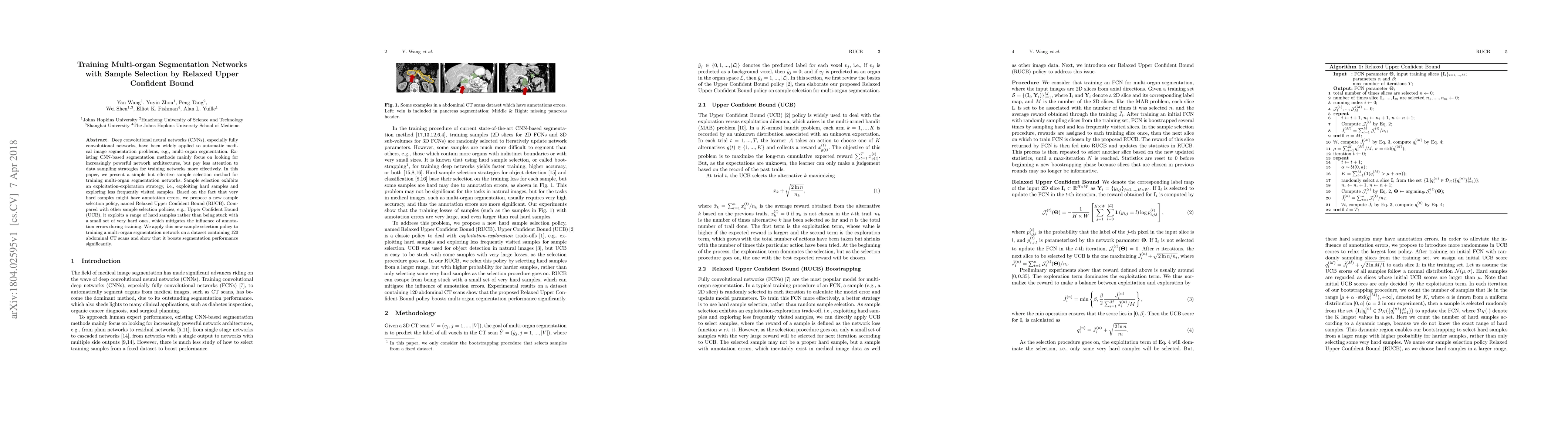 This paper introduces a novel sample selection method called Relaxed Upper Confident Bound (RUCB) to improve training of multi-organ segmentation networks. RUCB balances exploiting hard samples and exploring less frequent samples, effectively mitigating annotation errors and significantly enhancing segmentation performance on a dataset of 120 abdominal CT scans.
