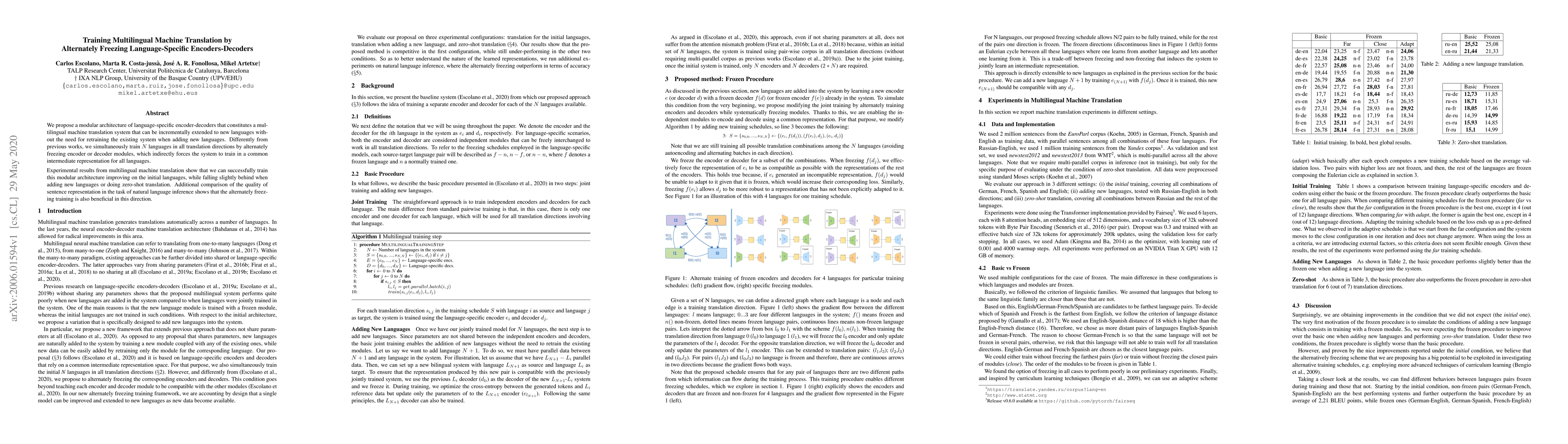 This paper introduces a modular multilingual machine translation system where language-specific encoder-decoders are alternately frozen during training, promoting a common intermediate representation. The approach allows incremental language addition without retraining, though it shows slight performance drops with new languages or zero-shot translation.