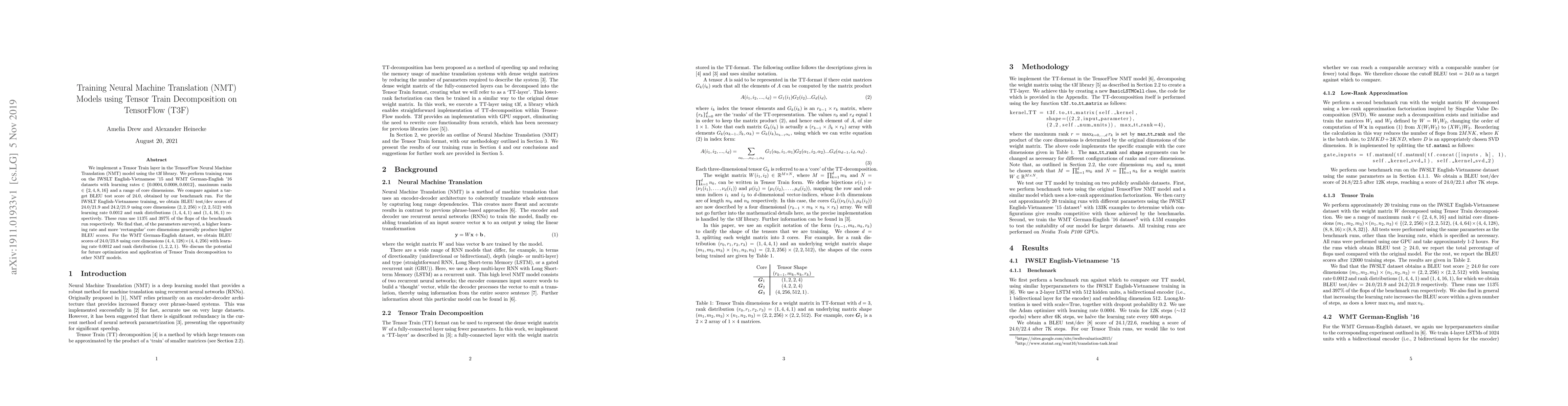 We implement a Tensor Train layer in the TensorFlow Neural Machine Translation (NMT) model using the t3f library. We perform training runs on the IWSLT English-Vietnamese '15 and WMT German-English '16 datasets with learning rates $\in \{0.0004,0.0008,0.0012\}$, maximum ranks $\in \{2,4,8,16\}$ and a range of core dimensions. We compare against a target BLEU test score of 24.0, obtained by our benchmark run. For the IWSLT English-Vietnamese training, we obtain BLEU test/dev scores of 24.0/21.9 and 24.2/21.9 using core dimensions $(2, 2, 256) \times (2, 2, 512)$ with learning rate 0.0012 and rank distributions $(1,4,4,1)$ and $(1,4,16,1)$ respectively. These runs use 113\% and 397\% of the flops of the benchmark run respectively. We find that, of the parameters surveyed, a higher learning rate and more `rectangular' core dimensions generally produce higher BLEU scores. For the WMT German-English dataset, we obtain BLEU scores of 24.0/23.8 using core dimensions $(4, 4, 128) \times (4, 4, 256)$ with learning rate 0.0012 and rank distribution $(1,2,2,1)$. We discuss the potential for future optimization and application of Tensor Train decomposition to other NMT models.