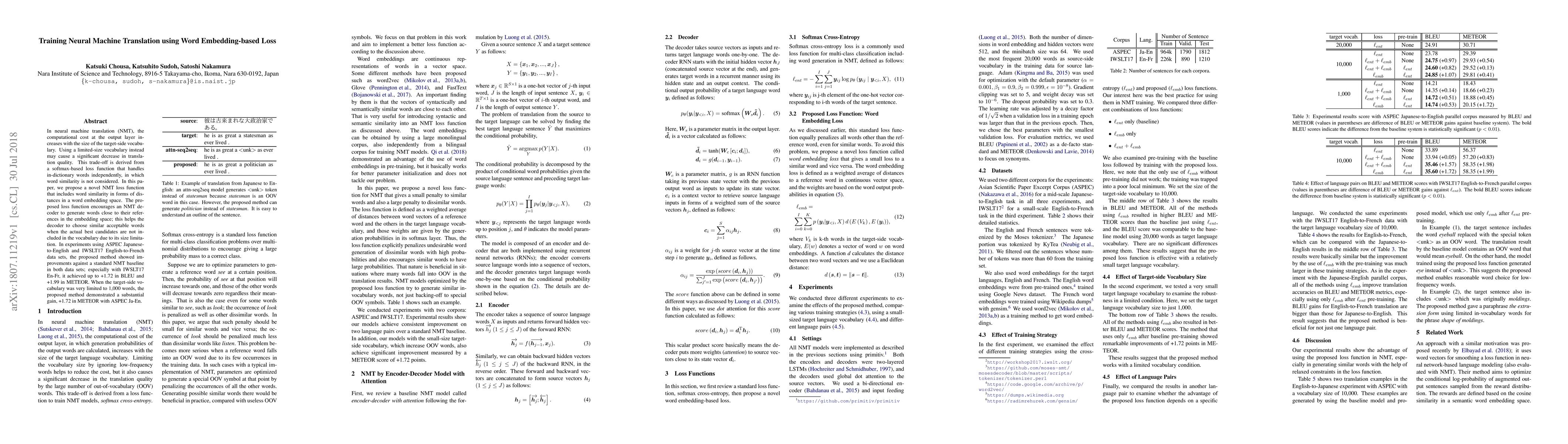This paper proposes a novel loss function for neural machine translation that incorporates word embeddings to consider word similarity, addressing the trade-off between vocabulary size and translation quality. The new method significantly improves translation quality on Japanese-to-English and English-to-French datasets, especially when vocabulary is limited.