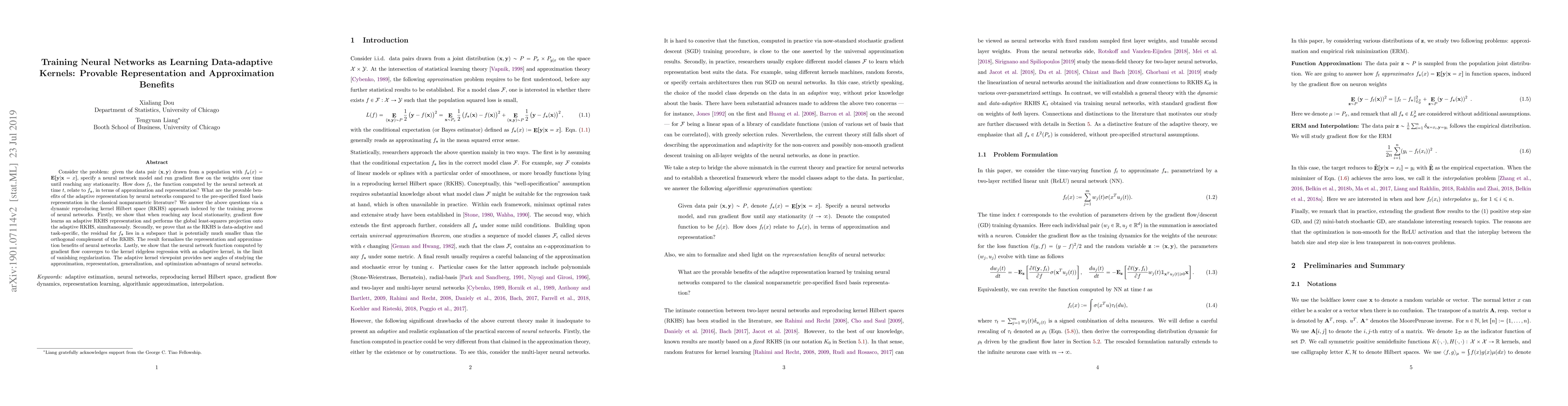 This paper investigates how neural networks trained via gradient flow adapt their representations to better approximate target functions, demonstrating that they learn data-adaptive kernels that outperform fixed basis representations. It shows that neural networks converge to kernel ridgeless regression with an adaptive kernel, highlighting their superior approximation and representation benefits.