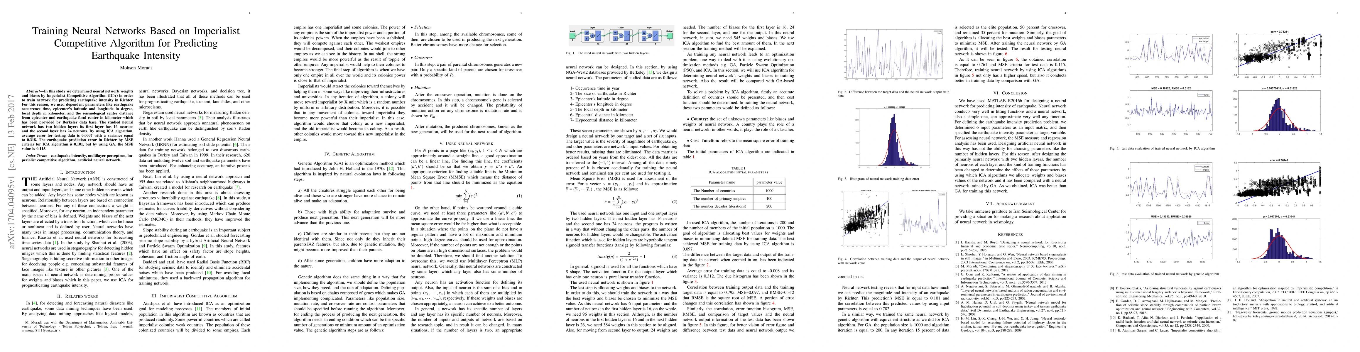 This study uses the Imperialist Competitive Algorithm (ICA) to train a neural network for predicting earthquake intensity in Richter scale. The neural network, with two hidden layers, achieved an average testing error of 0.0007 and a mean squared error (MSE) of 0.101, outperforming genetic algorithm (GA) with an MSE of 0.115.