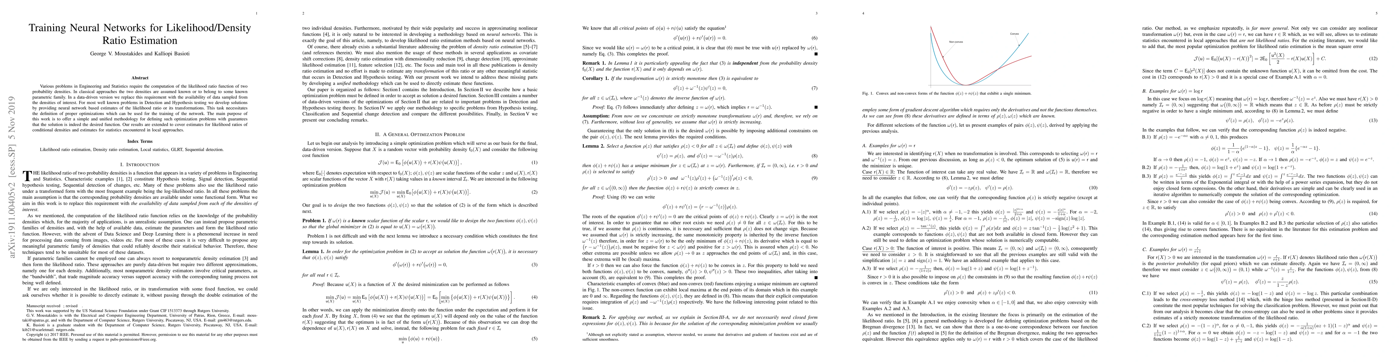 This paper proposes a neural network-based methodology for estimating likelihood ratio functions from data, addressing detection and hypothesis testing problems. It introduces optimization techniques for training the networks, ensuring accurate estimation of likelihood ratios and related statistics.