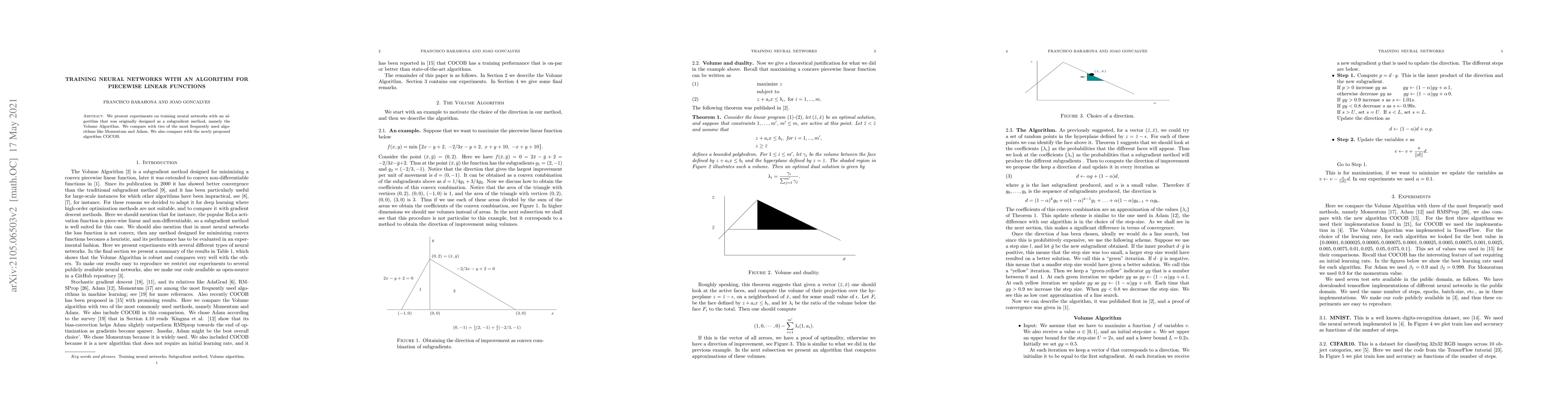 We present experiments on training neural networks with an algorithm that was originally designed as a subgradient method, namely the Volume Algorithm. We compare with two of the most frequently used algorithms like Momentum and Adam. We also compare with the newly proposed algorithm COCOB.