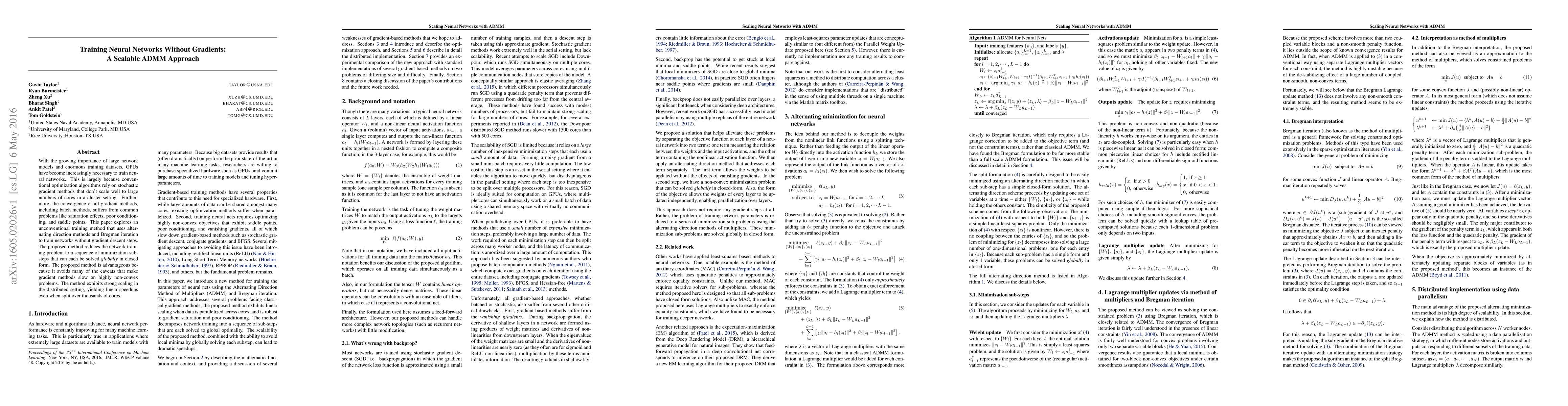 With the growing importance of large network models and enormous training datasets, GPUs have become increasingly necessary to train neural networks. This is largely because conventional optimization algorithms rely on stochastic gradient methods that don't scale well to large numbers of cores in a cluster setting. Furthermore, the convergence of all gradient methods, including batch methods, suffers from common problems like saturation effects, poor conditioning, and saddle points. This paper explores an unconventional training method that uses alternating direction methods and Bregman iteration to train networks without gradient descent steps. The proposed method reduces the network training problem to a sequence of minimization sub-steps that can each be solved globally in closed form. The proposed method is advantageous because it avoids many of the caveats that make gradient methods slow on highly non-convex problems. The method exhibits strong scaling in the distributed setting, yielding linear speedups even when split over thousands of cores.