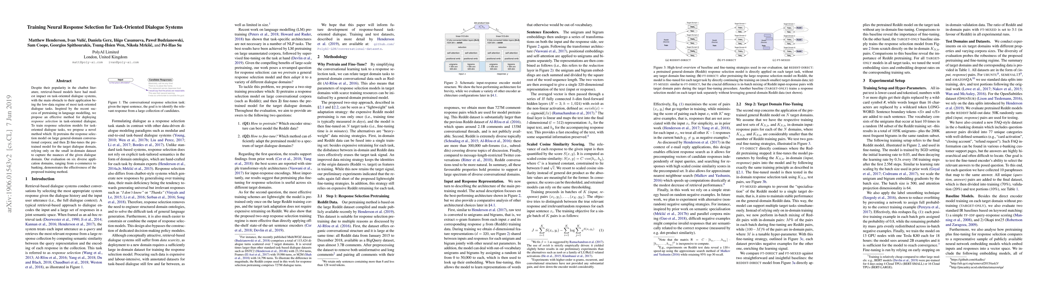 This paper proposes a method for training neural response selection in task-oriented dialogue systems by pretraining on large general-domain corpora and fine-tuning with small in-domain datasets. The approach shows effectiveness across various domains, improving performance in low-data scenarios.