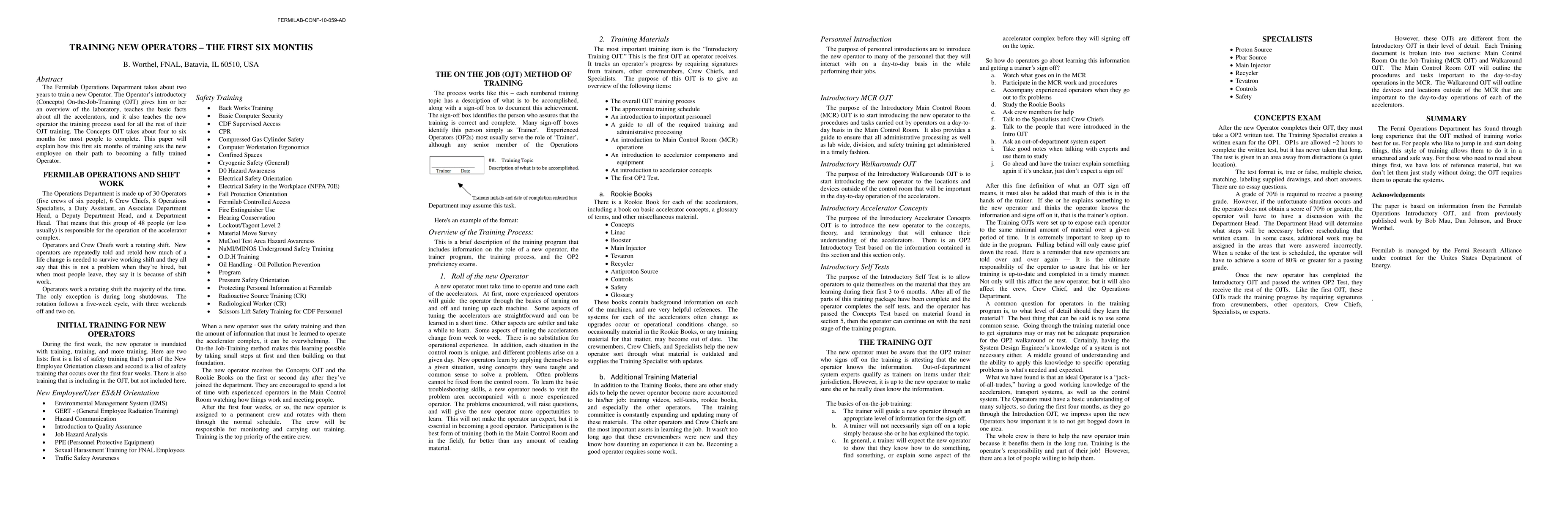 The Fermilab Operations Department takes about two years to train a new Operator. The Operator's introductory (Concepts) On-the-Job-Training (OJT) gives him or her an overview of the laboratory, teaches the basic facts about all the accelerators, and it also teaches the new operator the training process used for all the rest of their OJT training. The Concepts OJT takes about four to six months for most people to complete. This paper will explain how this first six months of training sets the new employee on their path to becoming a fully trained Operator.