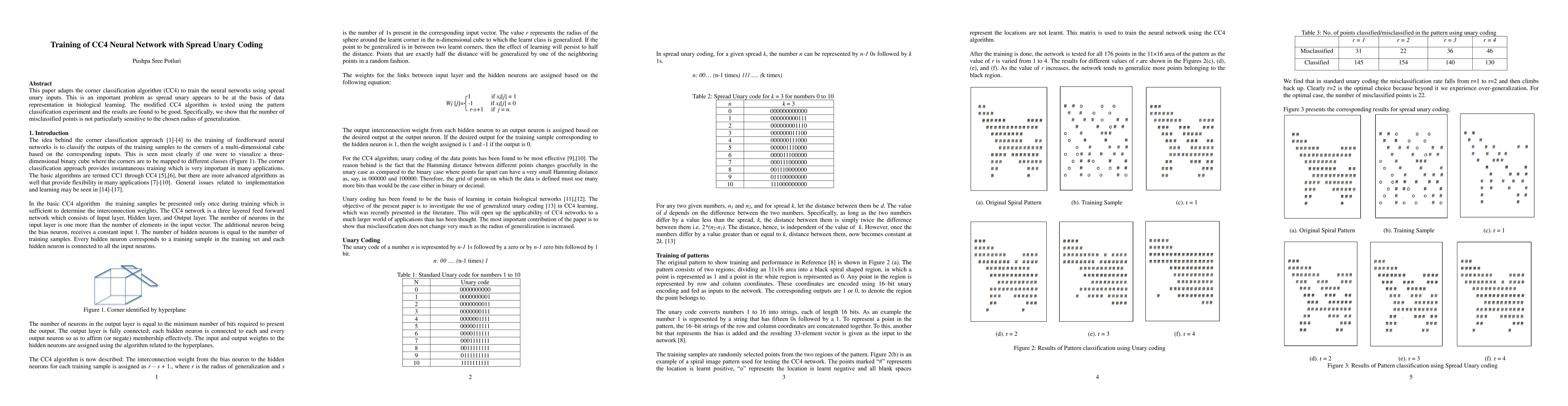 This paper adapts the corner classification algorithm (CC4) to train neural networks using spread unary inputs, demonstrating effective pattern classification with minimal sensitivity to the generalization radius.