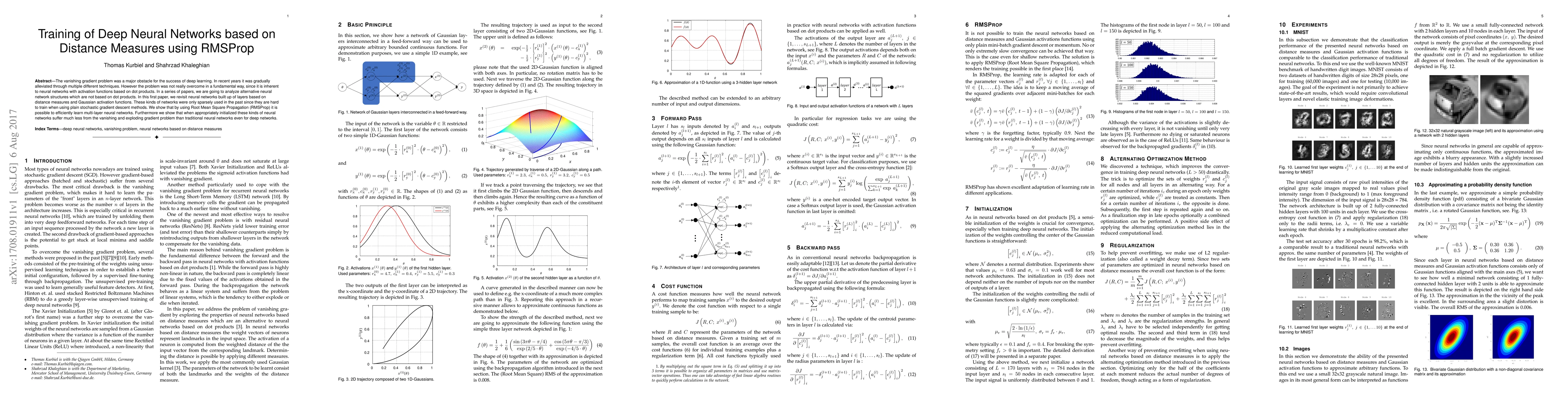 The vanishing gradient problem was a major obstacle for the success of deep learning. In recent years it was gradually alleviated through multiple different techniques. However the problem was not really overcome in a fundamental way, since it is inherent to neural networks with activation functions based on dot products. In a series of papers, we are going to analyze alternative neural network structures which are not based on dot products. In this first paper, we revisit neural networks built up of layers based on distance measures and Gaussian activation functions. These kinds of networks were only sparsely used in the past since they are hard to train when using plain stochastic gradient descent methods. We show that by using Root Mean Square Propagation (RMSProp) it is possible to efficiently learn multi-layer neural networks. Furthermore we show that when appropriately initialized these kinds of neural networks suffer much less from the vanishing and exploding gradient problem than traditional neural networks even for deep networks.