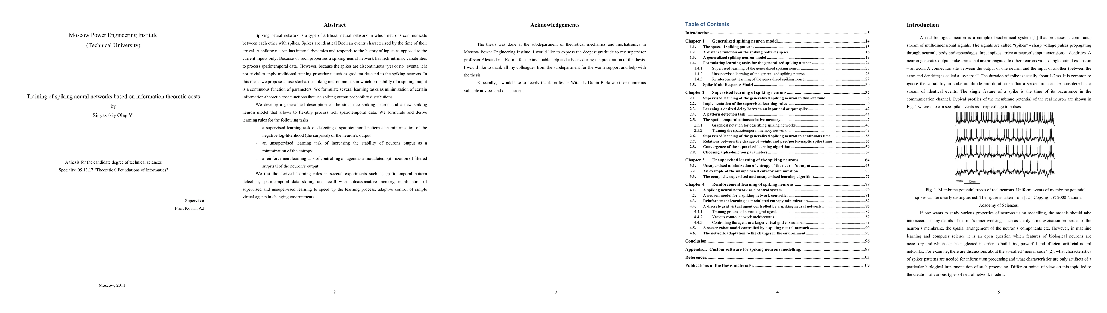Spiking neural network is a type of artificial neural network in which neurons communicate between each other with spikes. Spikes are identical Boolean events characterized by the time of their arrival. A spiking neuron has internal dynamics and responds to the history of inputs as opposed to the current inputs only. Because of such properties a spiking neural network has rich intrinsic capabilities to process spatiotemporal data. However, because the spikes are discontinuous 'yes or no' events, it is not trivial to apply traditional training procedures such as gradient descend to the spiking neurons. In this thesis we propose to use stochastic spiking neuron models in which probability of a spiking output is a continuous function of parameters. We formulate several learning tasks as minimization of certain information-theoretic cost functions that use spiking output probability distributions. We develop a generalized description of the stochastic spiking neuron and a new spiking neuron model that allows to flexibly process rich spatiotemporal data. We formulate and derive learning rules for the following tasks: - a supervised learning task of detecting a spatiotemporal pattern as a minimization of the negative log-likelihood (the surprisal) of the neuron's output - an unsupervised learning task of increasing the stability of neurons output as a minimization of the entropy - a reinforcement learning task of controlling an agent as a modulated optimization of filtered surprisal of the neuron's output. We test the derived learning rules in several experiments such as spatiotemporal pattern detection, spatiotemporal data storing and recall with autoassociative memory, combination of supervised and unsupervised learning to speed up the learning process, adaptive control of simple virtual agents in changing environments.
