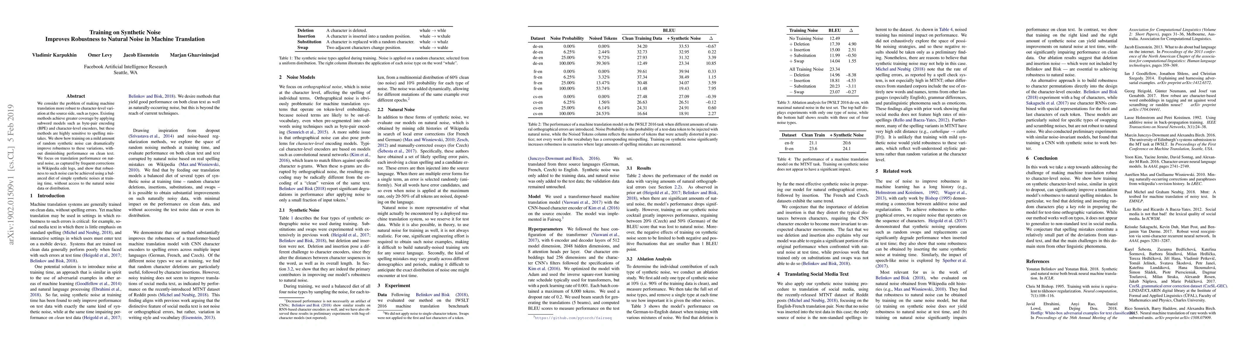 This paper demonstrates that training machine translation models on synthetic noise enhances their robustness to character-level variations like typos, without affecting performance on clean text. The approach achieves improved translation performance under natural noise, as evidenced by frequent corrections in Wikipedia edit logs, using a synthetic noise training strategy.