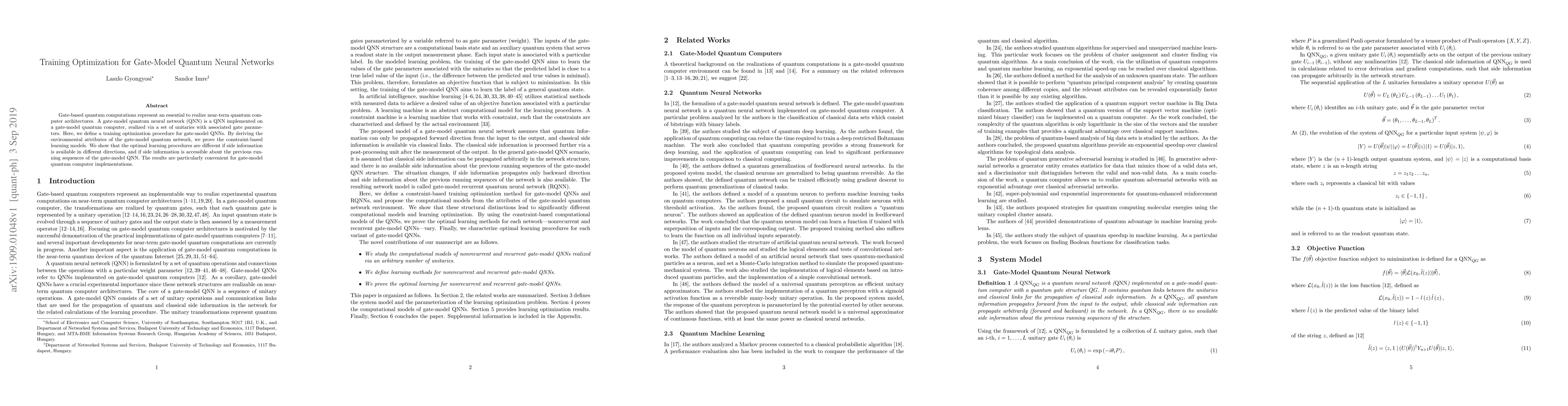 Gate-based quantum computations represent an essential to realize near-term quantum computer architectures. A gate-model quantum neural network (QNN) is a QNN implemented on a gate-model quantum computer, realized via a set of unitaries with associated gate parameters. Here, we define a training optimization procedure for gate-model QNNs. By deriving the environmental attributes of the gate-model quantum network, we prove the constraint-based learning models. We show that the optimal learning procedures are different if side information is available in different directions, and if side information is accessible about the previous running sequences of the gate-model QNN. The results are particularly convenient for gate-model quantum computer implementations.