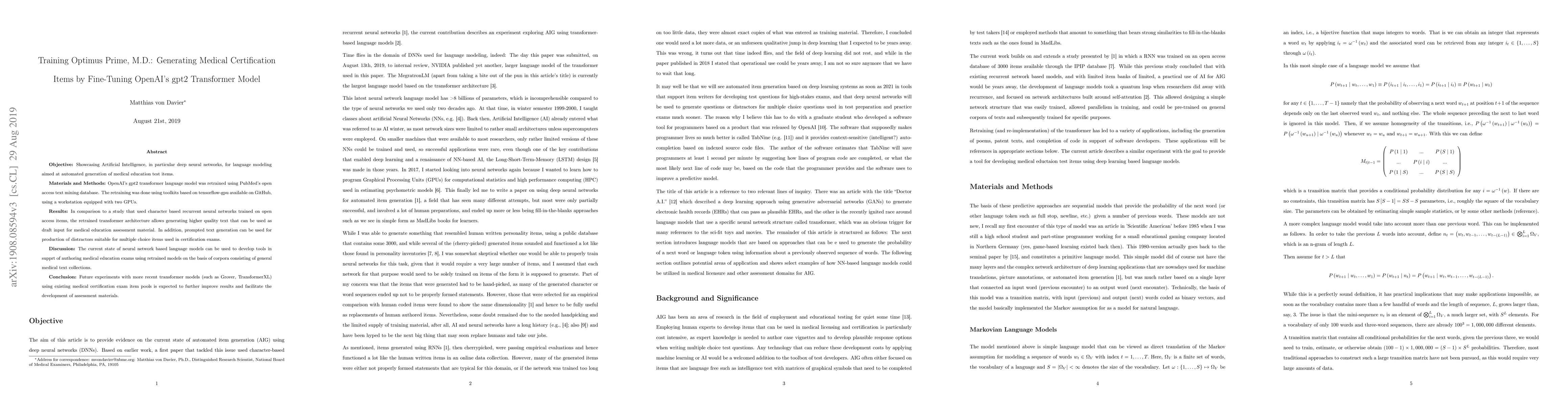 The research fine-tunes OpenAI's GPT-2 transformer model using a public domain text mining set of PubMed articles to generate item stems and distractor proposals for multiple-choice items in medical certification testing.