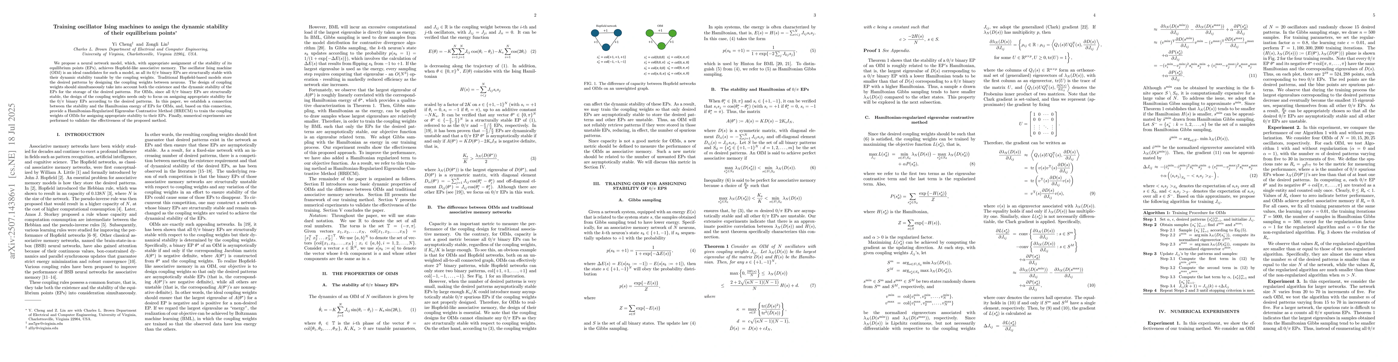 We propose a neural network model, which, with appropriate assignment of the stability of its equilibrium points (EPs), achieves Hopfield-like associative memory. The oscillator Ising machine (OIM) is an ideal candidates for such a model, as all its $0/\pi$ binary EPs are structurally stable with their dynamic stability tunable by the coupling weights. Traditional Hopfield-based models store the desired patterns by designing the coupling weights between neurons. The design of coupling weights should simultaneously take into account both the existence and the dynamic stability of the EPs for the storage of the desired patterns. For OIMs, since all $0/\pi$ binary EPs are structurally stable, the design of the coupling weights needs only to focus on assigning appropriate stability for the $0/\pi$ binary EPs according to the desired patterns. In this paper, we establish a connection between the stability and the Hamiltonian energy of EPs for OIMs, and, based on this connection, provide a Hamiltonian-Regularized Eigenvalue Contrastive Method (HRECM) to train the coupling weights of OIMs for assigning appropriate stability to their EPs. Finally, numerical experiments are performed to validate the effectiveness of the proposed method.