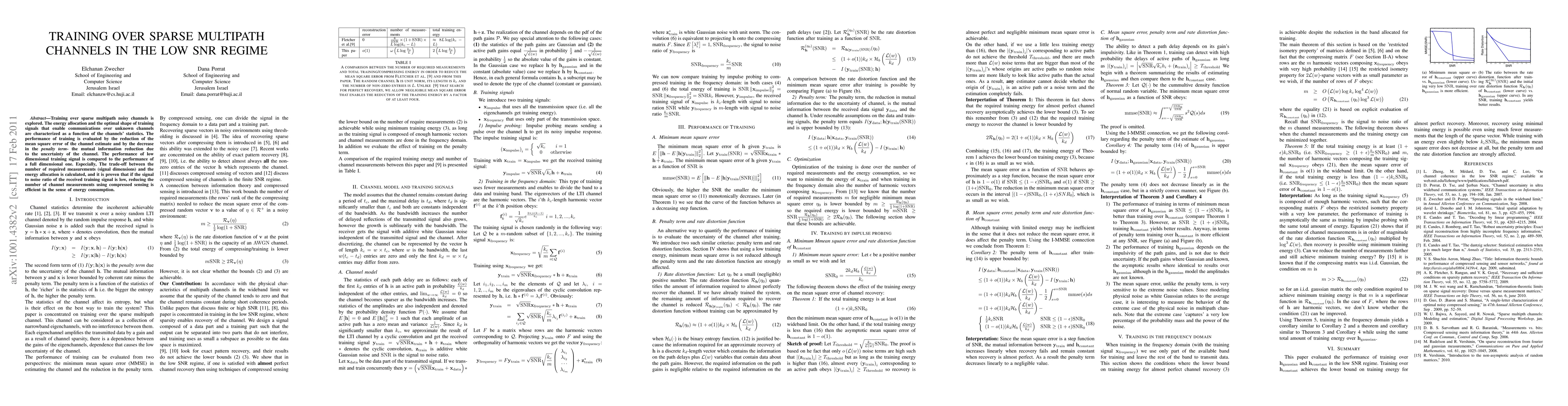 This paper investigates training strategies for sparse multipath channels under low SNR conditions, focusing on energy allocation and optimal training signal shapes. It demonstrates how channel entropy and sparsity influence the number of required measurements for effective compressed sensing-based training, highlighting the low entropy of sparse channels that facilitates training in low SNR environments.