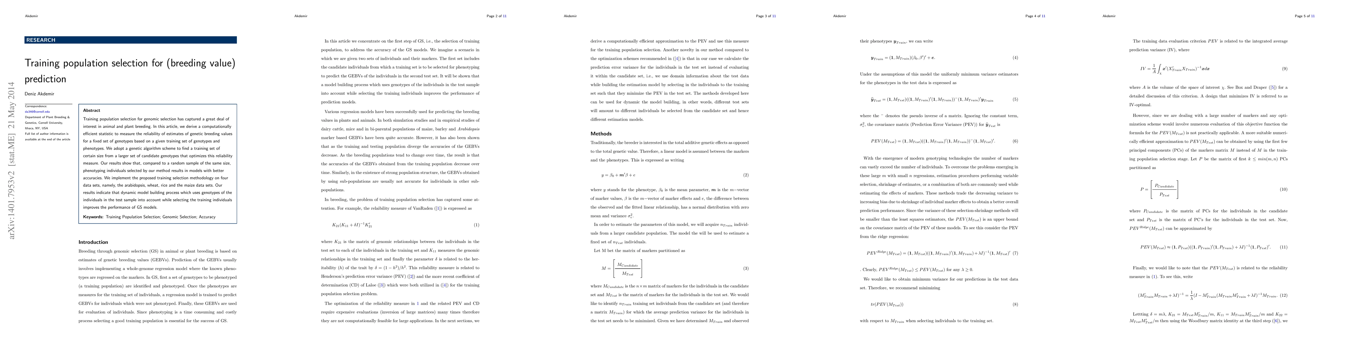 Training population selection for genomic selection has captured a great deal of interest in animal and plant breeding. In this article, we derive a computationally efficient statistic to measure the reliability of estimates of genetic breeding values for a fixed set of genotypes based on a given training set of genotypes and phenotypes. We adopt a genetic algorithm scheme to find a training set of certain size from a larger set of candidate genotypes that optimizes this reliability measure. Our results show that, compared to a random sample of the same size, phenotyping individuals selected by our method results in models with better accuracies. We implement the proposed training selection methodology on four data sets, namely, the arabidopsis, wheat, rice and the maize data sets. Our results indicate that dynamic model building process which uses genotypes of the individuals in the test sample into account while selecting the training individuals improves the performance of GS models.