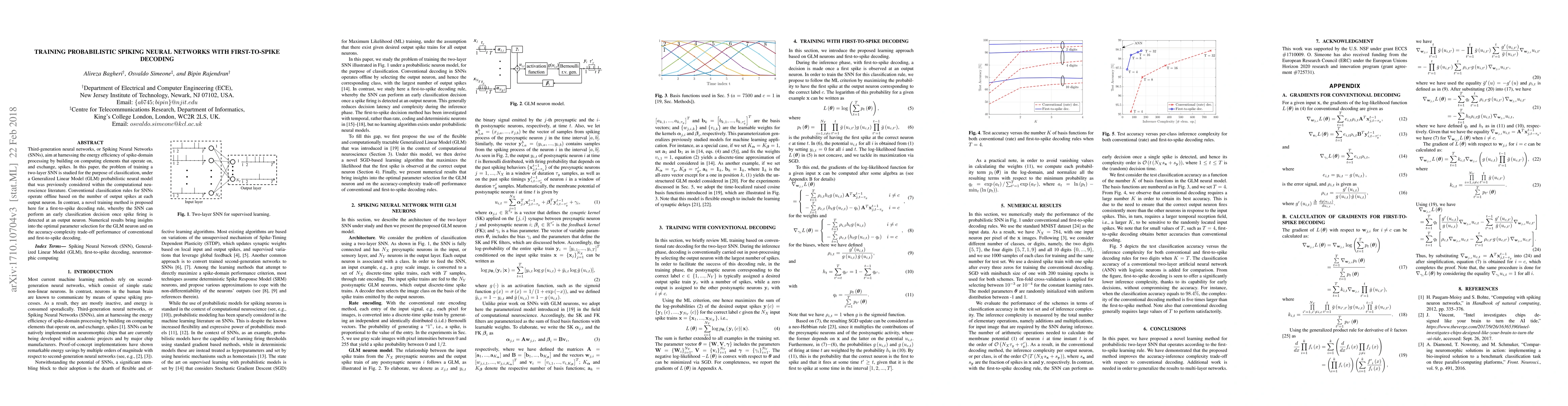 Third-generation neural networks, or Spiking Neural Networks (SNNs), aim at harnessing the energy efficiency of spike-domain processing by building on computing elements that operate on, and exchange, spikes. In this paper, the problem of training a two-layer SNN is studied for the purpose of classification, under a Generalized Linear Model (GLM) probabilistic neural model that was previously considered within the computational neuroscience literature. Conventional classification rules for SNNs operate offline based on the number of output spikes at each output neuron. In contrast, a novel training method is proposed here for a first-to-spike decoding rule, whereby the SNN can perform an early classification decision once spike firing is detected at an output neuron. Numerical results bring insights into the optimal parameter selection for the GLM neuron and on the accuracy-complexity trade-off performance of conventional and first-to-spike decoding.