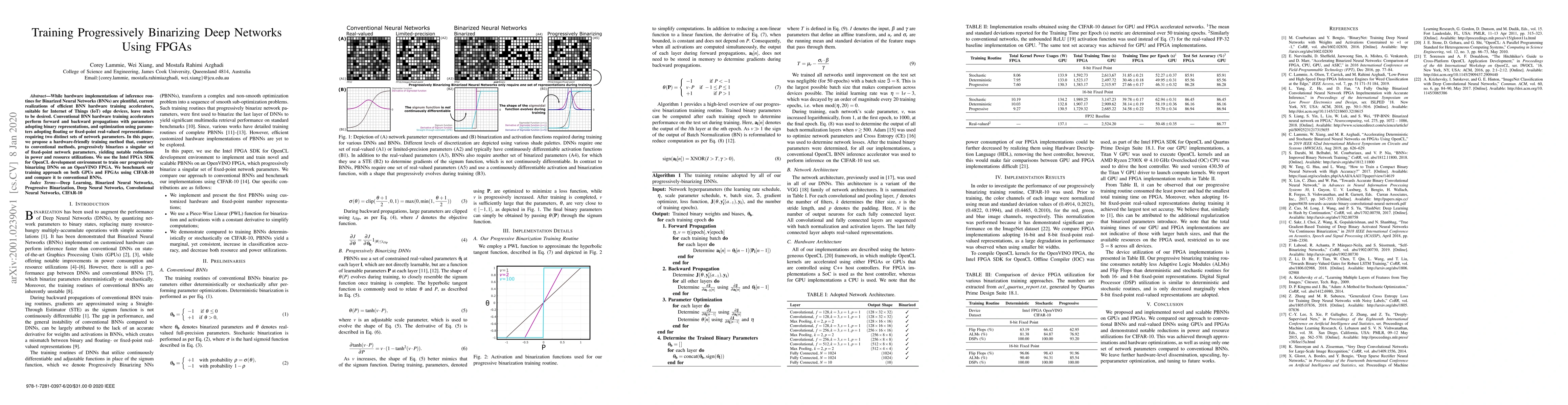 This paper proposes a novel hardware-friendly training method for Binarized Neural Networks (BNNs) that progressively binarizes a single set of fixed-point parameters, reducing power and resource usage. The method is implemented on an OpenVINO FPGA using Intel SDK, and its performance is benchmarked against conventional BNNs on GPUs and FPGAs using CIFAR-10 dataset.