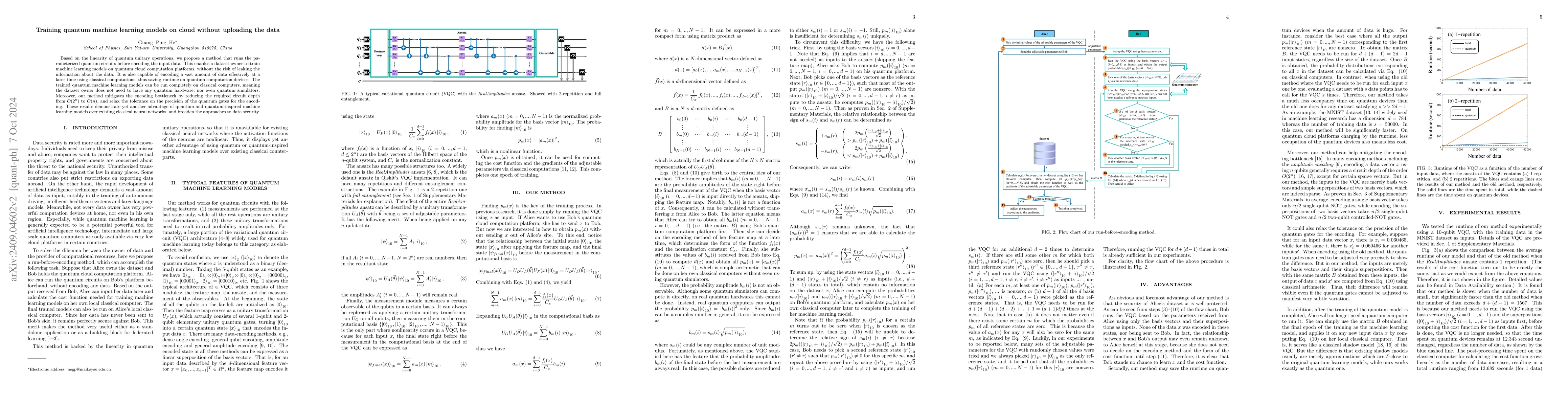 This paper proposes a method to train quantum machine learning models on cloud platforms without uploading data, leveraging quantum unitary operations to encode input data. The approach enhances data security and reduces circuit depth, allowing the model to run on classical computers without quantum hardware.