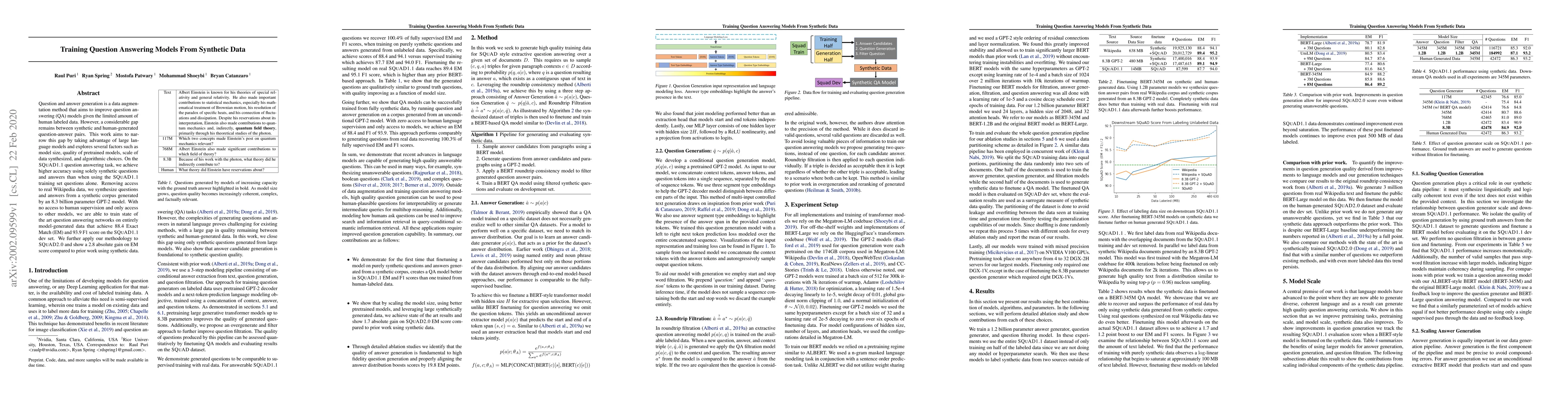 Question and answer generation is a data augmentation method that aims to improve question answering (QA) models given the limited amount of human labeled data. However, a considerable gap remains between synthetic and human-generated question-answer pairs. This work aims to narrow this gap by taking advantage of large language models and explores several factors such as model size, quality of pretrained models, scale of data synthesized, and algorithmic choices. On the SQuAD1.1 question answering task, we achieve higher accuracy using solely synthetic questions and answers than when using the SQuAD1.1 training set questions alone. Removing access to real Wikipedia data, we synthesize questions and answers from a synthetic corpus generated by an 8.3 billion parameter GPT-2 model. With no access to human supervision and only access to other models, we are able to train state of the art question answering networks on entirely model-generated data that achieve 88.4 Exact Match (EM) and 93.9 F1 score on the SQuAD1.1 dev set. We further apply our methodology to SQuAD2.0 and show a 2.8 absolute gain on EM score compared to prior work using synthetic data.