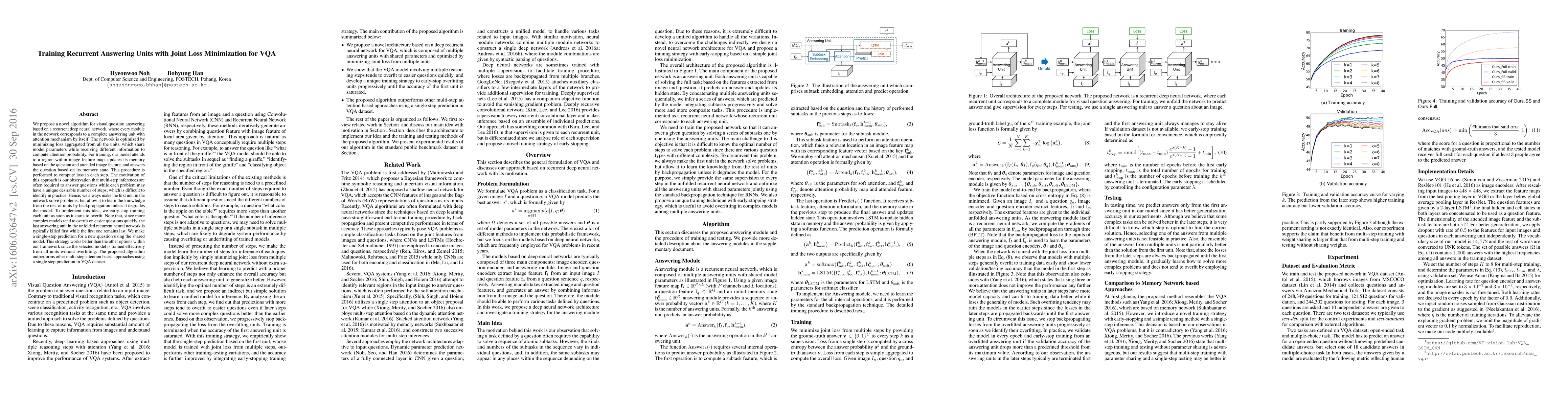 This paper introduces a recurrent neural network for visual question answering (VQA) that employs multiple answering units with attention mechanisms, optimized through joint loss minimization. The network trains by attending to image regions, updating memory, and answering questions, with early-stop mechanisms to prevent overfitting, allowing the first unit to learn from others while remaining robust. This approach outperforms other multi-step methods using single-step predictions.