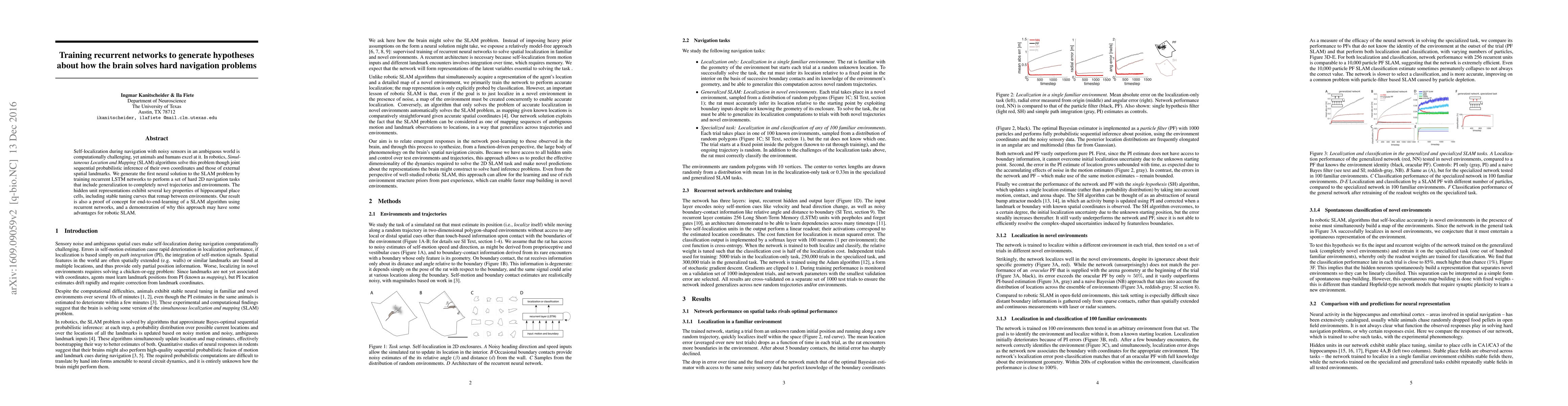 This paper trains LSTM networks to solve complex navigation tasks, demonstrating a neural solution to SLAM that generalizes to new environments. The networks exhibit properties akin to hippocampal place cells, suggesting potential advantages for robotic navigation.