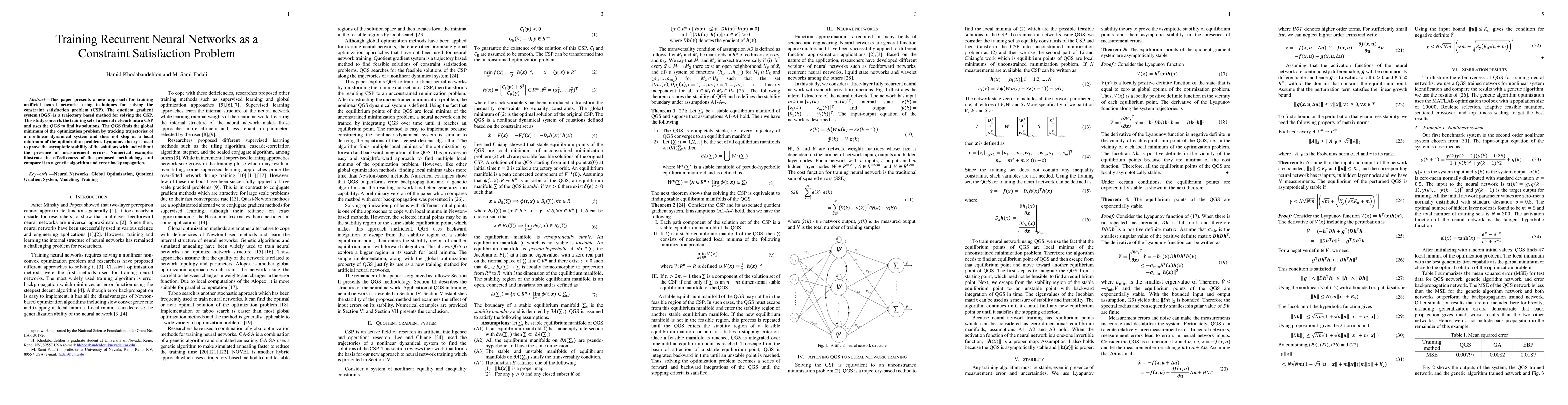 This paper proposes a novel training method for recurrent neural networks by framing it as a constraint satisfaction problem (CSP) and using the quotient gradient system (QGS) to find global minima, avoiding local minima. The method's effectiveness is demonstrated through numerical examples comparing it to genetic algorithms and error backpropagation.