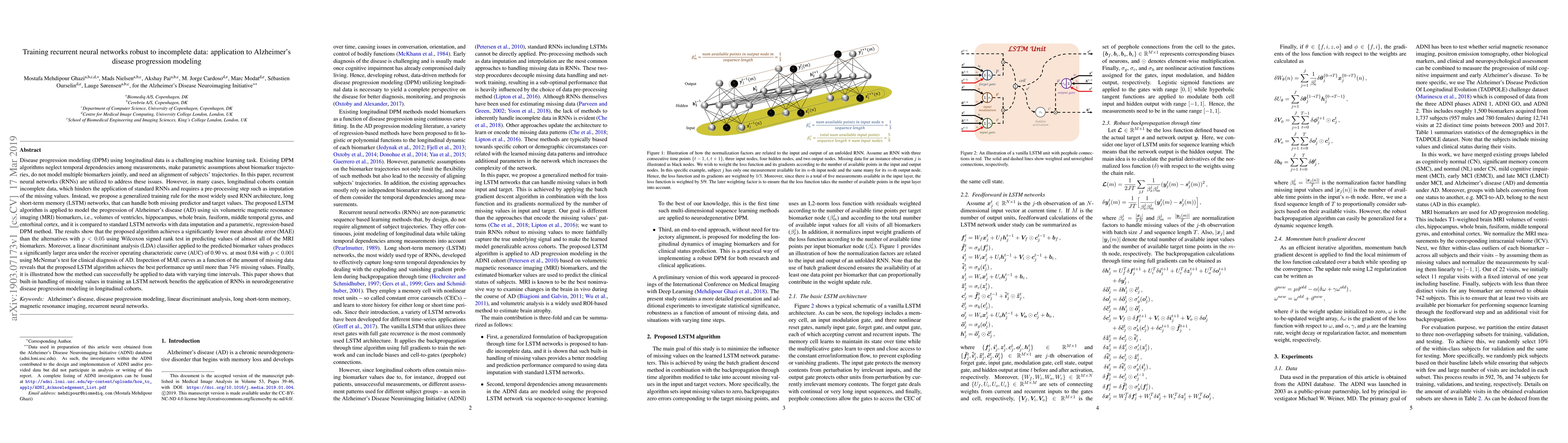 This paper proposes a generalized training rule for LSTM networks to model Alzheimer's disease progression using incomplete longitudinal MRI data, achieving lower mean absolute error and higher AUC for clinical diagnosis compared to standard LSTM and regression-based methods. The method maintains performance even with up to 74% missing data.