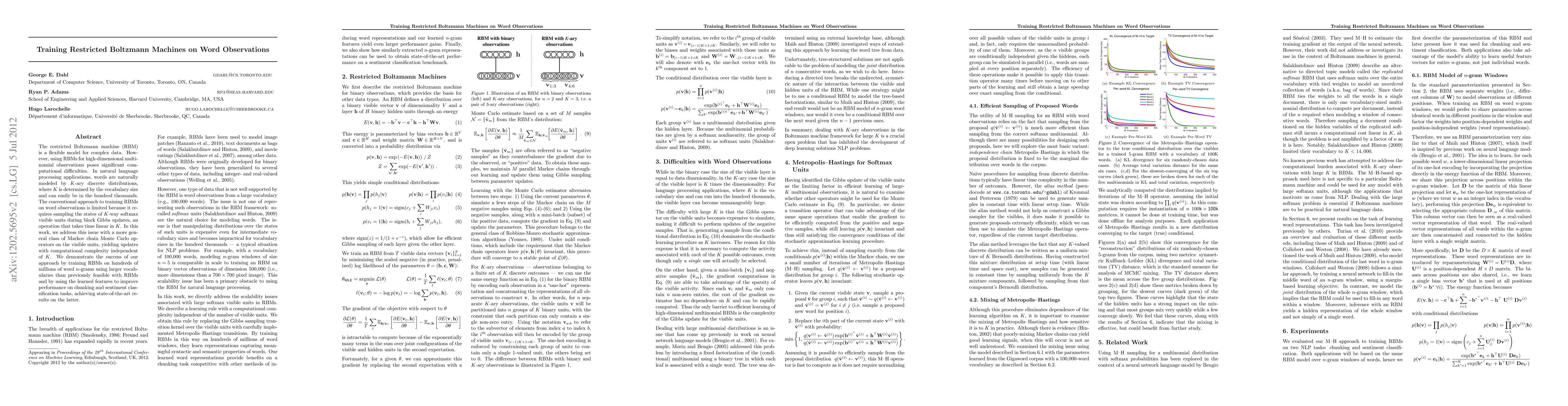 The restricted Boltzmann machine (RBM) is a flexible tool for modeling complex data, however there have been significant computational difficulties in using RBMs to model high-dimensional multinomial observations. In natural language processing applications, words are naturally modeled by K-ary discrete distributions, where K is determined by the vocabulary size and can easily be in the hundreds of thousands. The conventional approach to training RBMs on word observations is limited because it requires sampling the states of K-way softmax visible units during block Gibbs updates, an operation that takes time linear in K. In this work, we address this issue by employing a more general class of Markov chain Monte Carlo operators on the visible units, yielding updates with computational complexity independent of K. We demonstrate the success of our approach by training RBMs on hundreds of millions of word n-grams using larger vocabularies than previously feasible and using the learned features to improve performance on chunking and sentiment classification tasks, achieving state-of-the-art results on the latter.